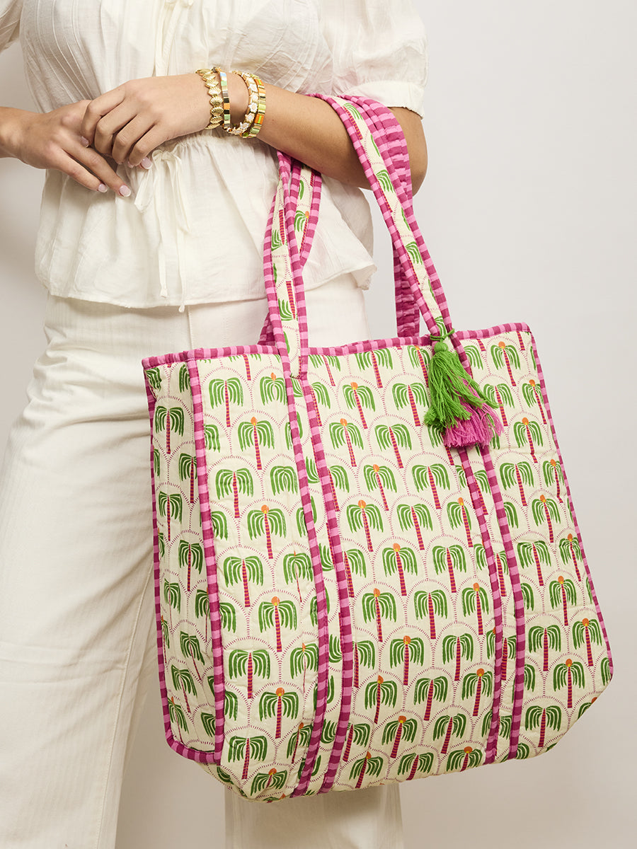 Add a splash of tropical fun to your everyday look with our Cancun Tote. Featuring a vibrant pink and green palm tree print and playful tassel detail, this roomy bag is perfect for beach days, shopping trips or relaxed weekends away.