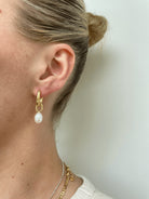 A sophisticated and timeless addition to your jewellery collection. These earrings feature a stunning freshwater pearl gracefully hanging from a gold oval hoop, creating an elegant and refined design.The combination of the radiant pearl and the sleek gold oval hoop creates a perfect harmony of classic and modern aesthetics. Whether you're attending a formal event or want to add a touch of elegance to your everyday style, the Prue Earring is the ideal choice. Upgrade your jewellery collection with these exquisite pearl earrings and let their timeless beauty and understated glamour reflect your unique sense of fashion and sophistication.