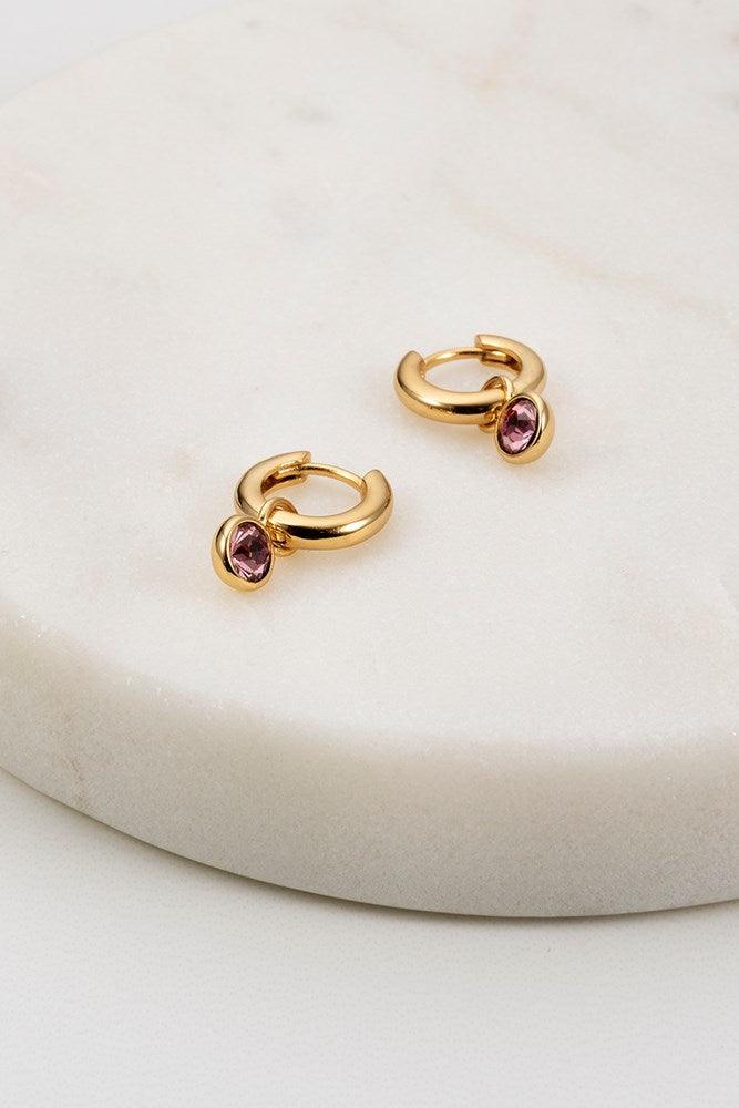 A stylish and eco-friendly accessory to elevate your look. These huggie size hoop earrings feature a delicate pink crystal drop that adds a touch of elegance to your outfit. Made of eco brass, the Tess Earring is a sustainable and high-quality choice for those who care about both fashion and the environment. The comfortable huggie style ensures that these earrings will stay in place all day long. Whether you're dressing up or down, the Tess Earring is the perfect accessory to add a touch of sophistication to your look. Upgrade your jewelry collection with the eco-friendly and stylish Tess Earring.