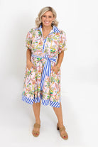 Step into effortless elegance with this beautifully crafted Alexander Santorini cotton dress. Designed exclusively in-house, it features a timeless button-through silhouette with soft, breathable cotton that feels light and comfortable all day. The crisp blue stripe detailing along the hem, collar, and sleeves adds a polished, refined touch, while the matching fabric belt cinches the waist for a flattering shape. Functional side pockets make this dress as practical as it is stylish – perfect for coastal strolls, brunches, or anywhere your day takes you.