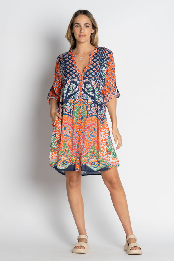 With a neat Nauru collar flowing into a flattering V neckline, button-through front, and tabbed sleeves for easy roll-up styling, it’s as practical as it is pretty. Side pockets and a gently curved hem add that extra touch of everyday ease. Pair it with sandals for the weekend or layer with a jacket for work — it’s an effortless choice you’ll wear again and again.