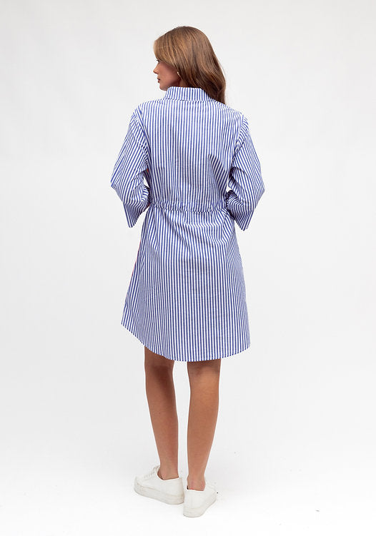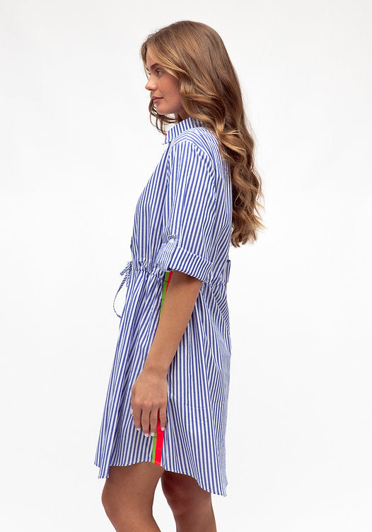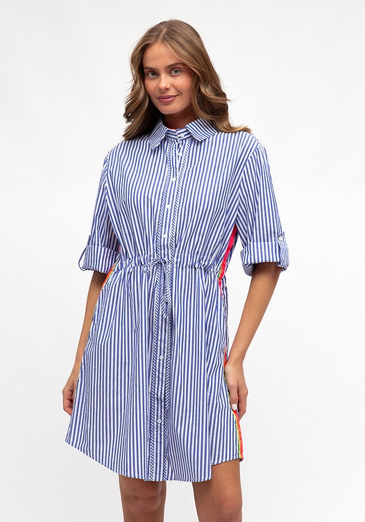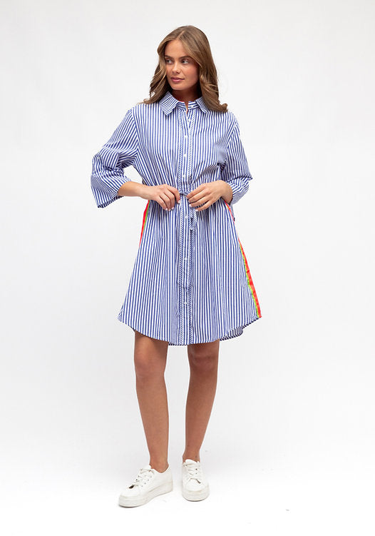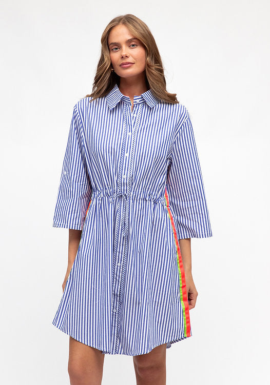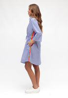 The Stella Shirt Dress is all about easy polish with a fun twist. Made from crisp 100% cotton, it features a timeless blue and white stripe, playful contrast side stripes, and a flattering drawstring waist for a relaxed yet shaped fit. The button front and collar keep it classic, while the gorgeous colourful stripe detail and side pockets add a little joy and practicality to your day.