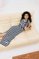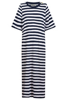 A casual dress with timeless stripe appeal. Made from a soft cotton blend with a slight stretch for comfort. Features a crew neckline, elbow-length sleeves, and a three-button placket at the shoulder. High side vent at the hem adds ease of movement. Falls to a flattering midi length.