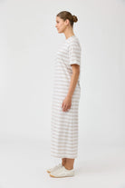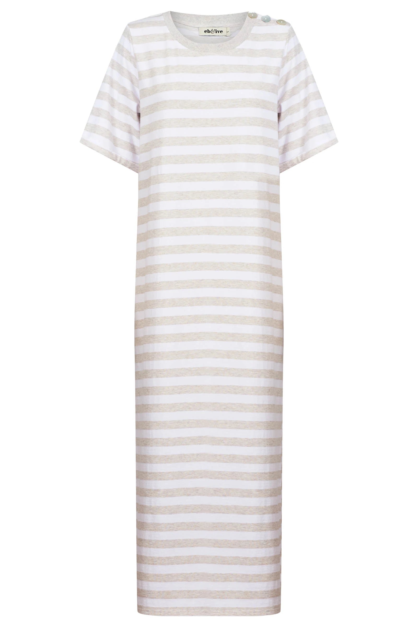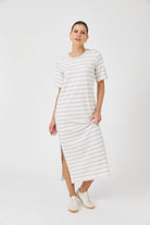 A casual dress with timeless stripe appeal. Made from a soft cotton blend with a slight stretch for comfort. Features a crew neckline, elbow-length sleeves, and a three-button placket at the shoulder. High side vent at the hem adds ease of movement. Falls to a flattering midi length.