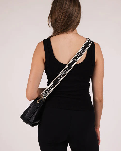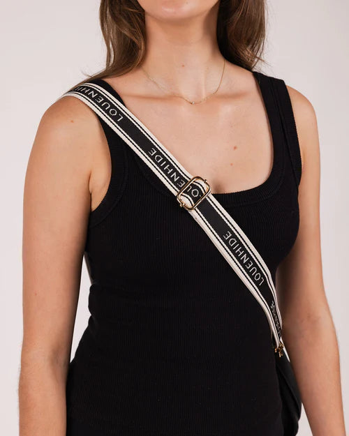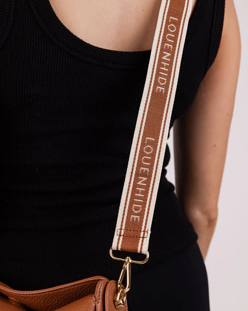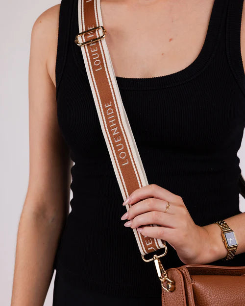 The Louenhide Logo Tan/Cream Contrast Guitar Strap is an elevated spin on our much loved adjustable and detachable sateen logo guitar straps. Designed to easily clip onto your favourite bag, its lightweight and comfortable webbing material makes this accent handbag strap perfect for everyday wear. Available in two easy to wear neutral colourways that feature a contrast Louenhide logo and gorgeous light gold hardware, our new women's guitar bag strap will effortlessly elevate your favourite Louenhide summer crossbody bags.