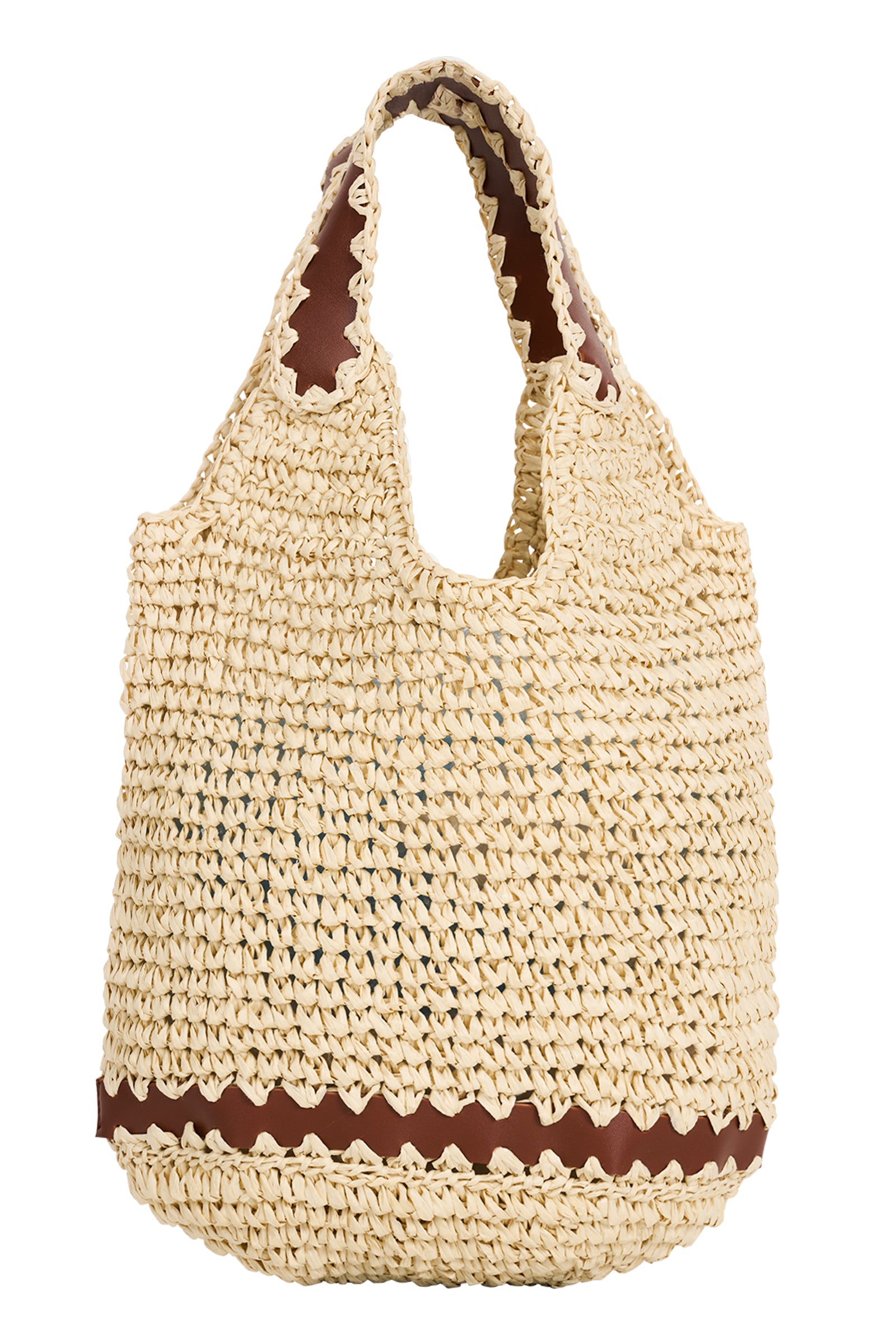 A mini woven tote featuring vegan leather accents and a modern structured design. The perfect natural accessory to elevate warm-weather looks.