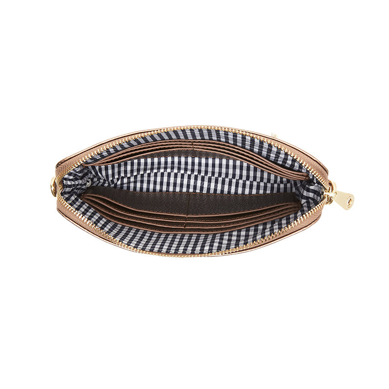 The Elms and King Bowery Wallet offers the functionality of a wallet, with the hands-free ease of a cross body. Made from premium polyurethane with 14-karat light gold-plated hardware, the Wallet has space inside for 12 credit cards and two open top slip pockets. With its adjustable/removable crossbody strap, this piece can be used as a compact clutch, shoulder bag or crossbody bag.