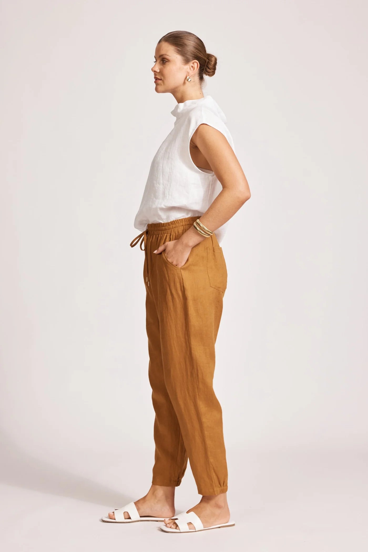 A relaxed jogger-inspired pant designed for effortless everyday style. Crafted from 100% linen for breathable comfort. Features an elasticated drawstring waist, tapered leg, and elastic at the back of the cuff. Side pockets add practicality.