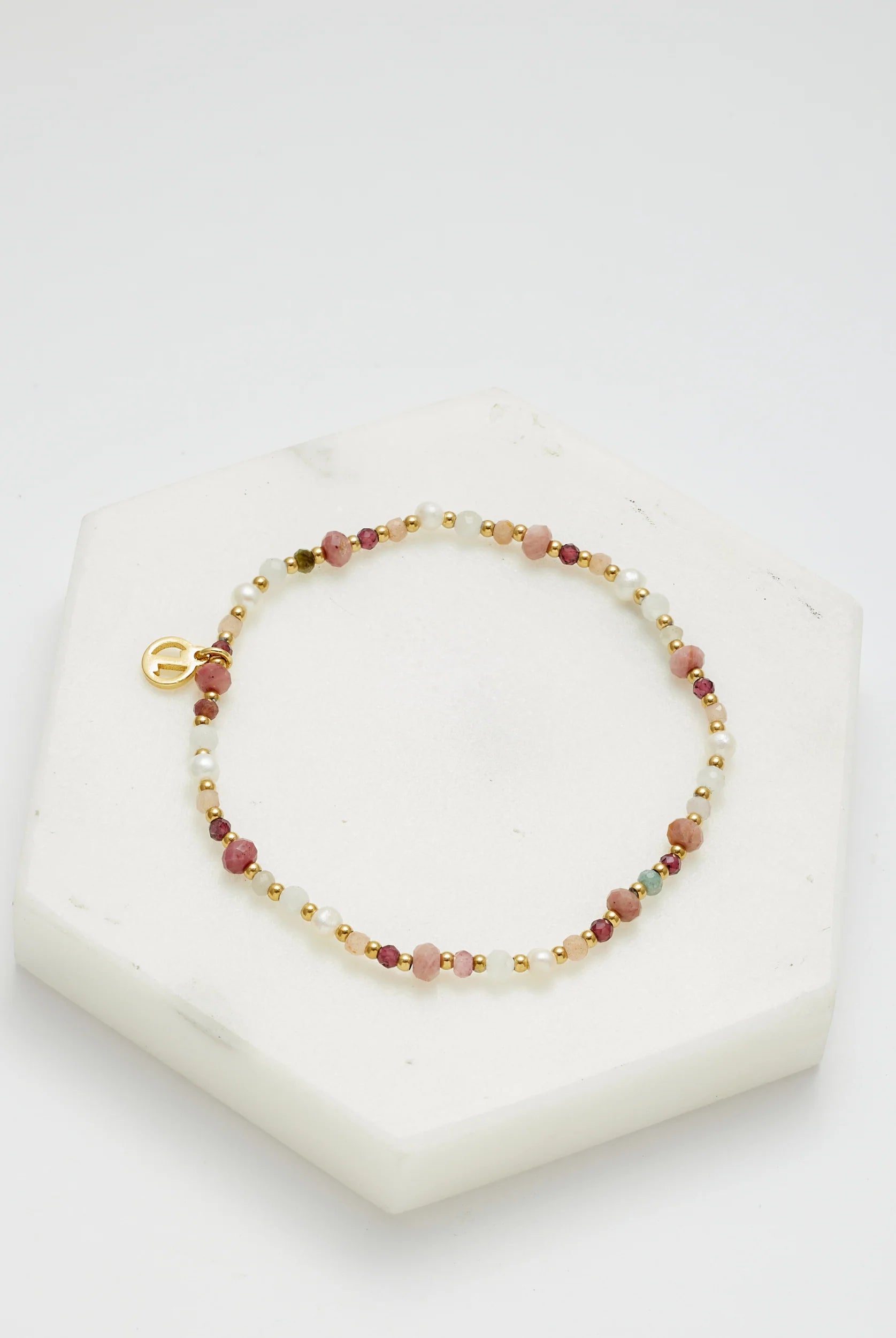 This bracelet features lustrous freshwater pearls combined with rouge-colored semi-precious stone beads, creating a stunning contrast of textures and colours. Crafted with meticulous attention to detail, the Harlow Bracelet showcases the natural beauty of these high-quality materials.