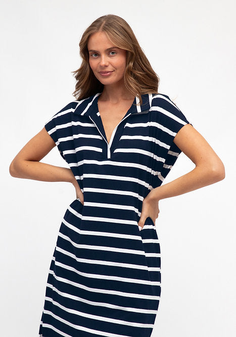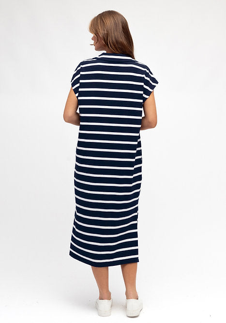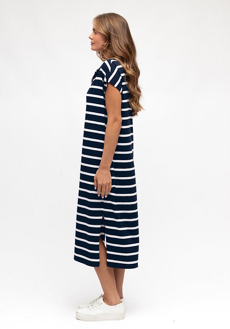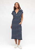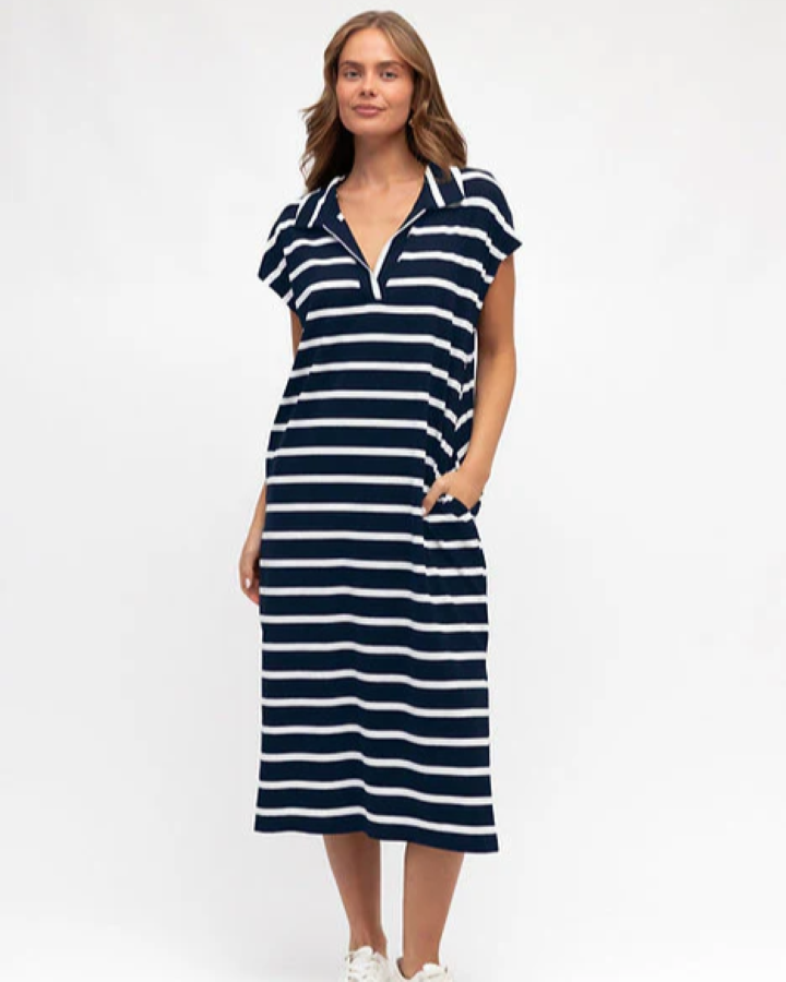 Easy, everyday dressing has never looked so good. The Isla Midi Polo Dress brings together classic style and laid-back comfort in the most effortless way. Made from 100% breathable cotton and designed with gentle stretch, it’s the kind of piece you’ll reach for when you want to feel pulled-together but still completely at ease. The timeless navy and white stripe, collared neckline, and cap sleeves give it that preppy-chic feel, while the side splits and relaxed silhouette keep things cool and casual. Bonus points for the handy pockets (because we know how important they are!).