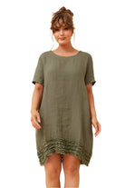This linen dress is perfect for any occasion with its relaxed fit, knee length and functional side pockets. The round neckline and short sleeves provide comfort, while the frill detail on the hemline adds a touch of style. Made in Italy for quality craftsmanship.