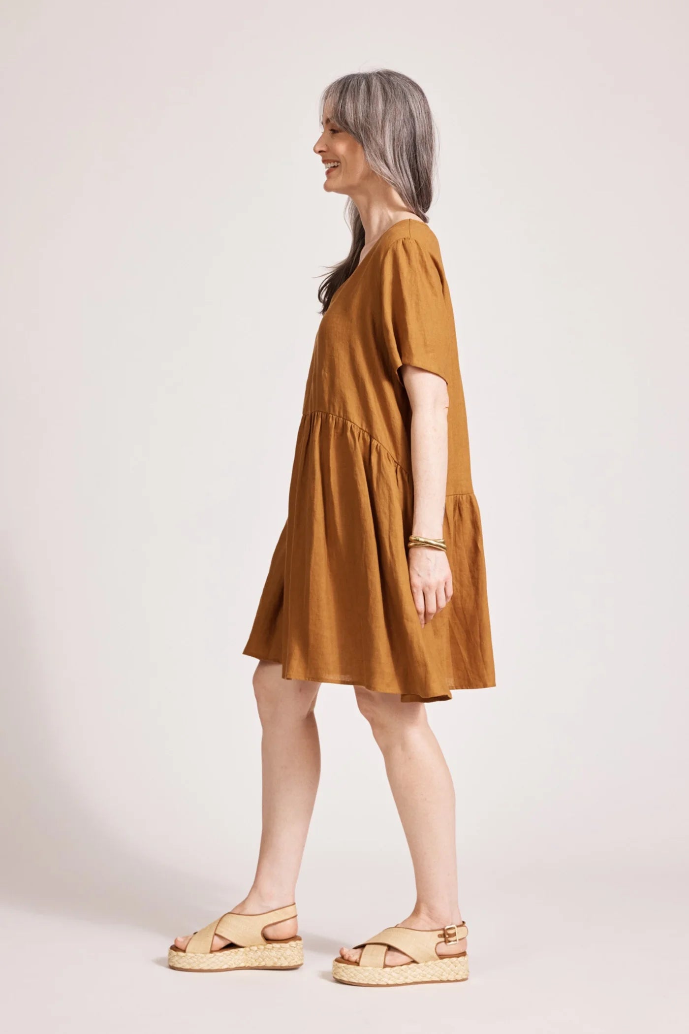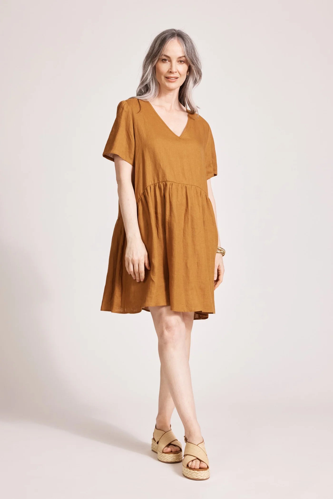 A relaxed midi dress for easy summer style and versatility. Crafted from 100% Linen for breathable comfort. Features a V neckline, short sleeves, drop diagonal waistline, and functional pockets.