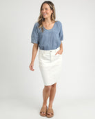 Meet your new go-to denim delight! The Belle Skirt is a playful twist on the classic denim skirt you know and love. Crafted from medium-weight stretch cotton denim, this midi-length skirt features a flattering straight cut, a zip front, and a fitted waist that hugs in all the right places. Hip pockets add a casual, easygoing vibe — perfect for day-to-day adventures or dressing up for a casual catch-up.