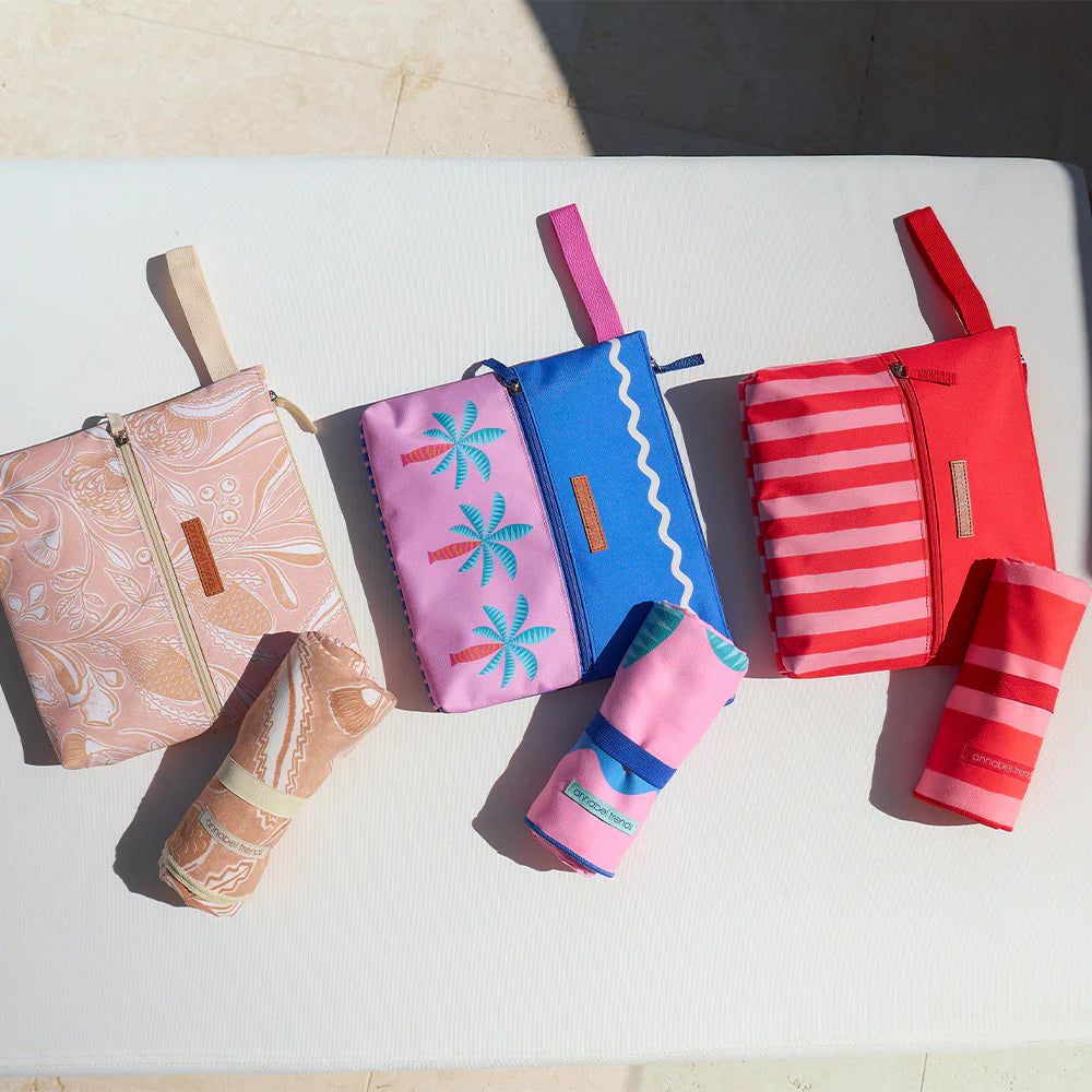 Say goodbye to soggy swimmers mixing with your dry essentials. Our Beach Wet Pouch is the handy little sidekick you didn’t know you needed! Designed with two zip-up sections to separate wet and dry items, plus a convenient wrist strap for grab-and-go ease — it’s perfect for beach days, pool hangs or spontaneous picnics.