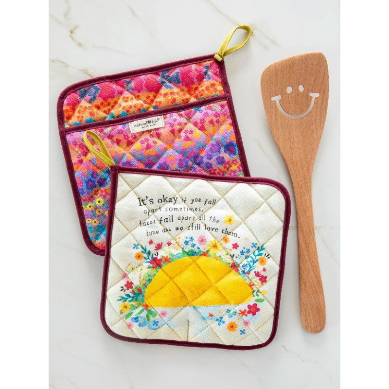 Update your plain potholder with our Potholder & Wooden Spoon Set that has a cute taco message and design on the front, and a floral print on the back. This fun kitchen set is also super useful! We included a hand pocket on the back of the potholder so you can grab a pot handle or baking pan in this adorable style. The smiley face-carved wooden spoon is great for all your cooking and baking needs.