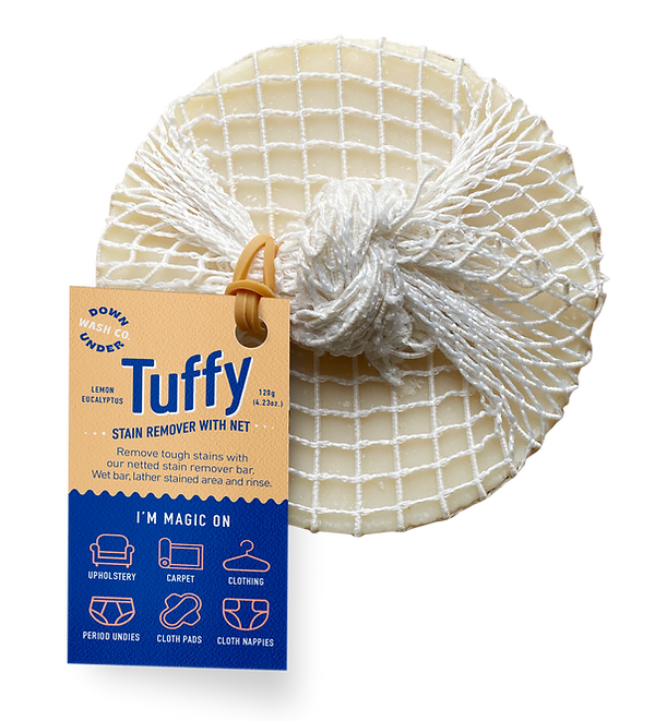 Looking for TUFF, well you’ve found it! Our handmade Tuffy soap is the magic all-rounder when it comes to removing tough stains. Packed full of Lemon Eucalyptus Essential Oil and covered with a net to enhance friction for greater stain removal. Use as a stain remover or pre-treater for machine or hand washing.