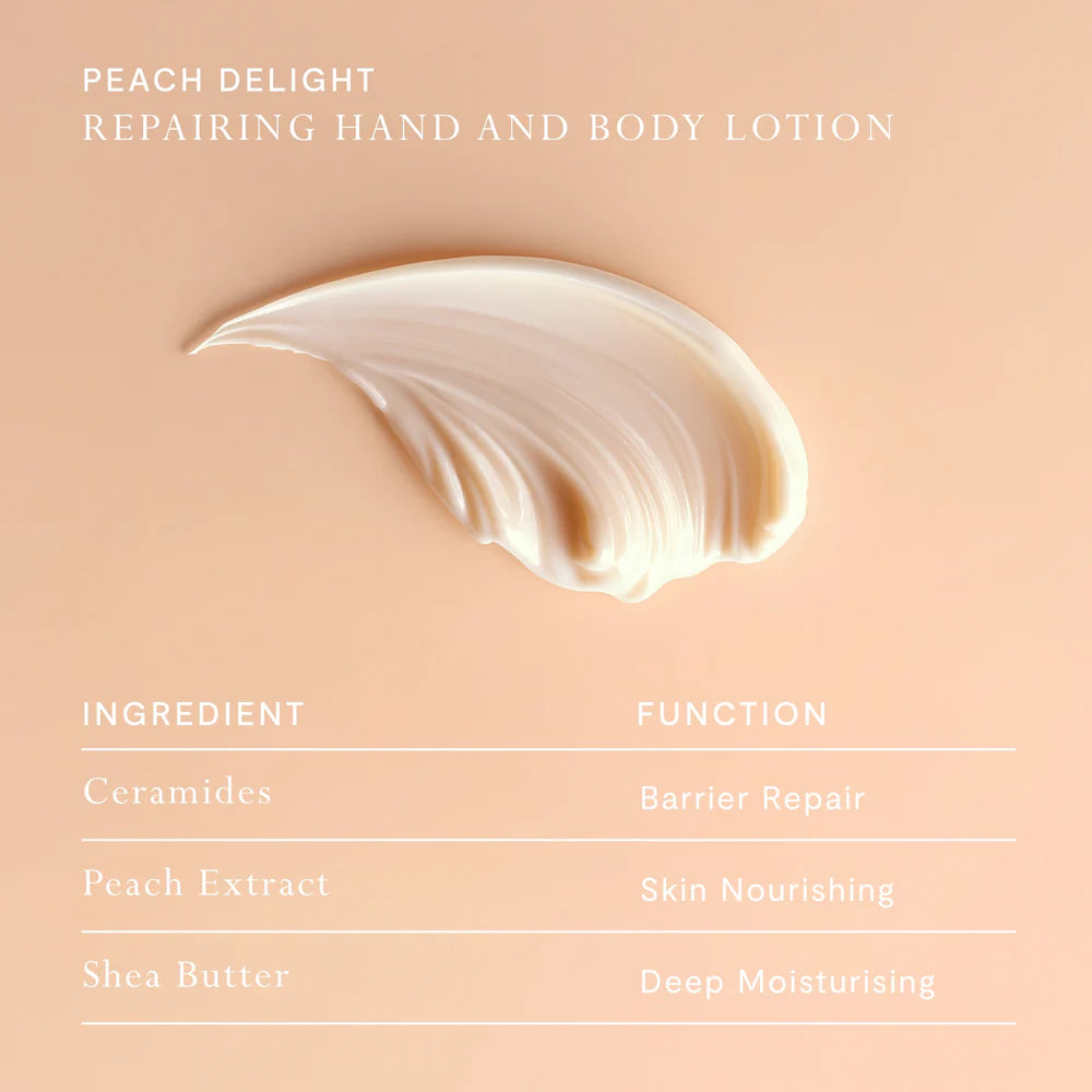 Enriched with Shea Butter, Ceramides, and Peach Extract, this luxurious lotion deeply hydrates and repairs the appearance of skin, enhancing its natural moisture barrier. Its creamy texture absorbs quickly, infusing the nourishing benefits of Jojoba Oil and Glycerin. This rich formula deeply moisturises, leaving skin silky-soft and delicately scented.