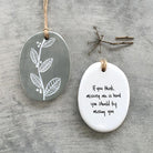 Perfect for gifting. A hole is punched at the top and a sturdy piece of string attached, allowing this to be hung on the wall, from a hook or on a cupboard door. Made of white porcelain, matte finish.