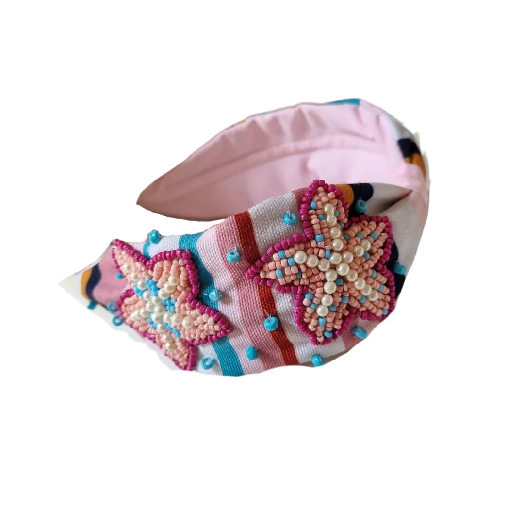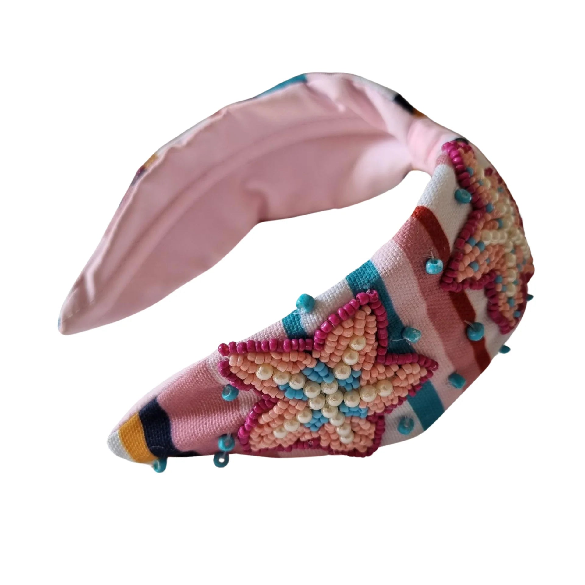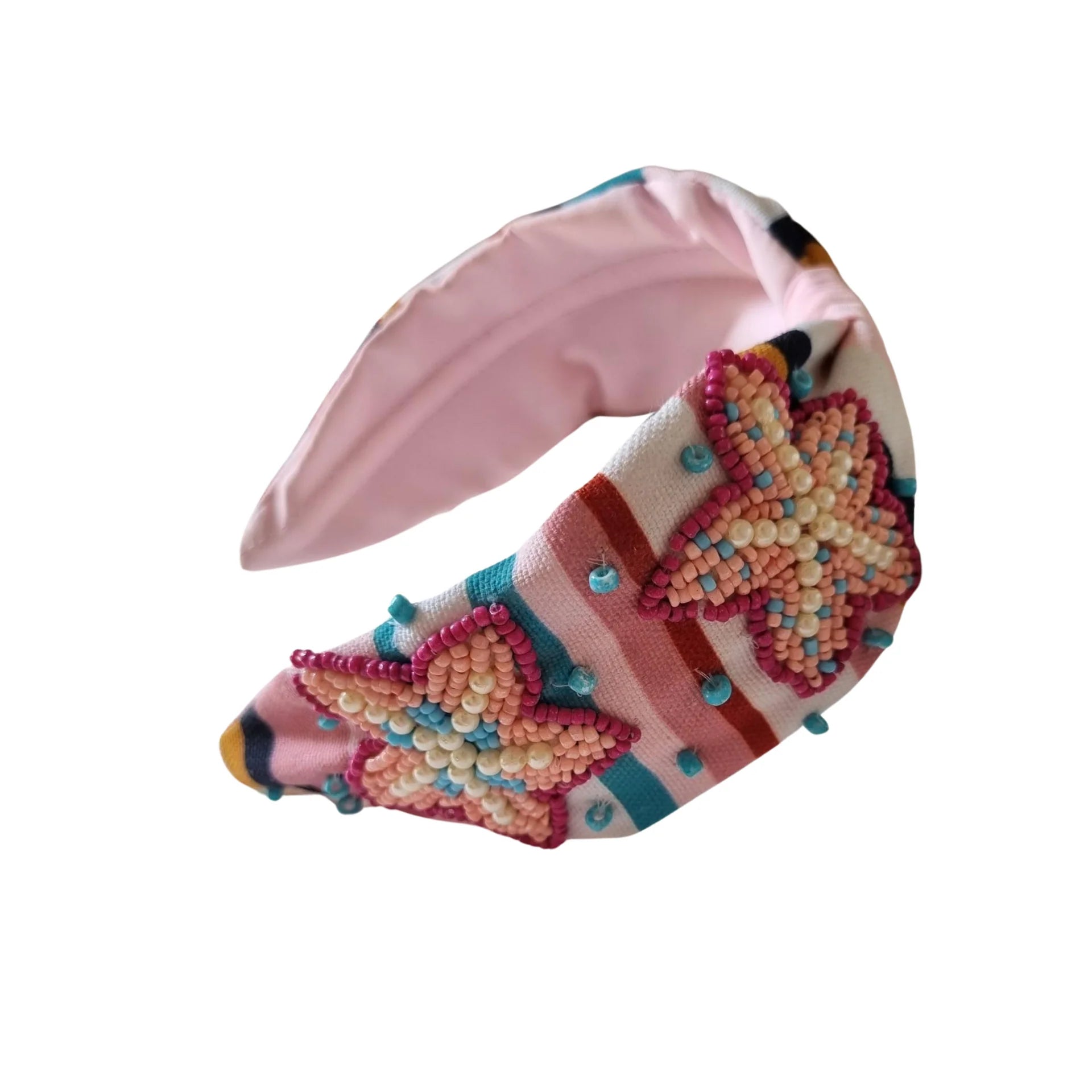 Add a touch of whimsy to your look with our Star Beaded Headband. The beaded stars in shades of pink and aqua add a playful element to any outfit. Made with a comfortable stripe fabric, this headband is both stylish and functional. Perfect for any occasion, it's a must-have accessory for your collection.