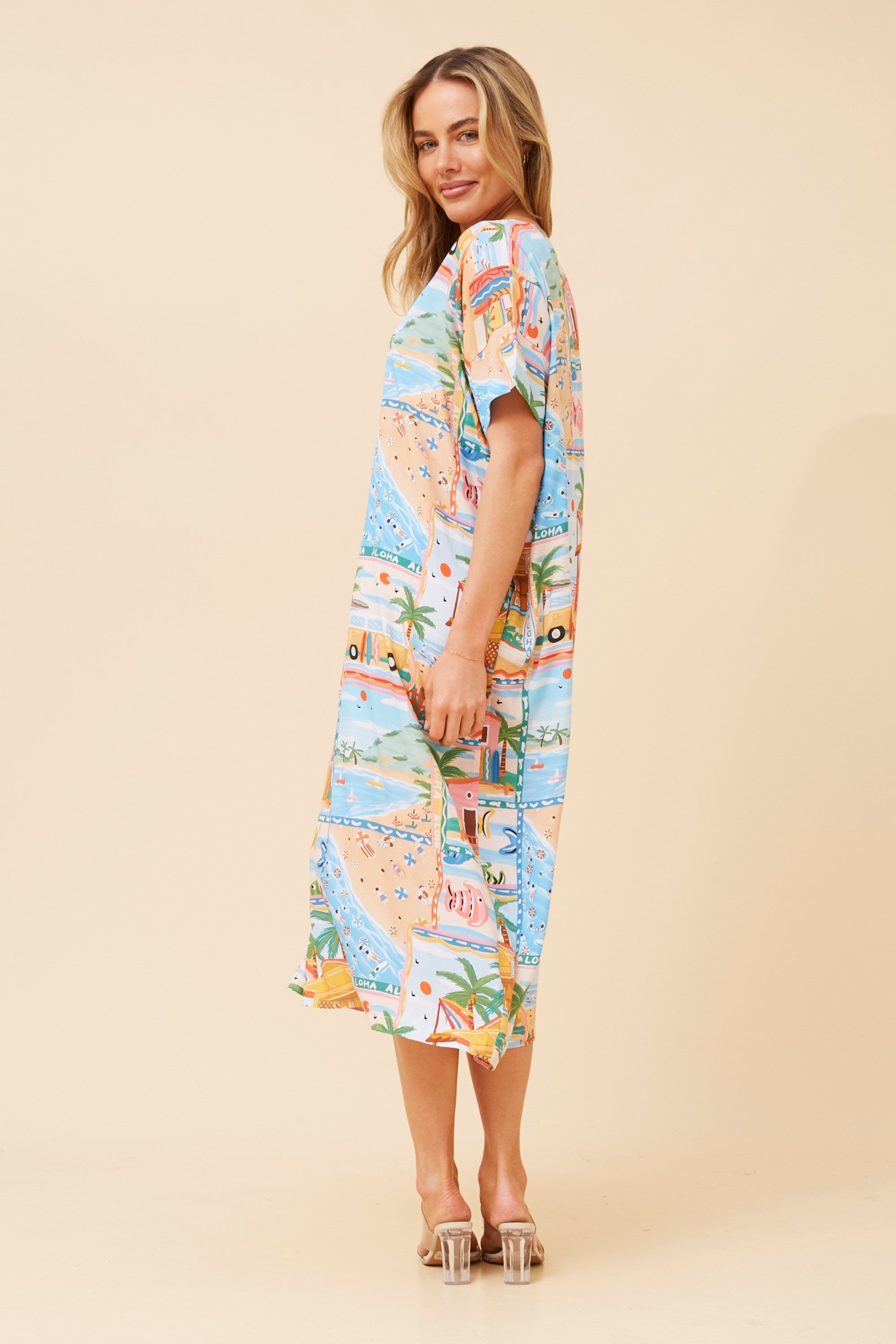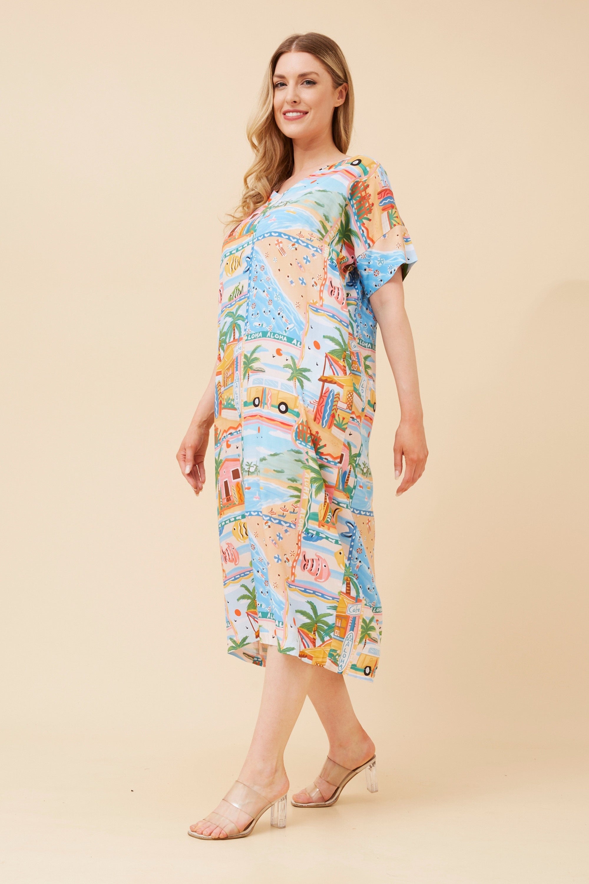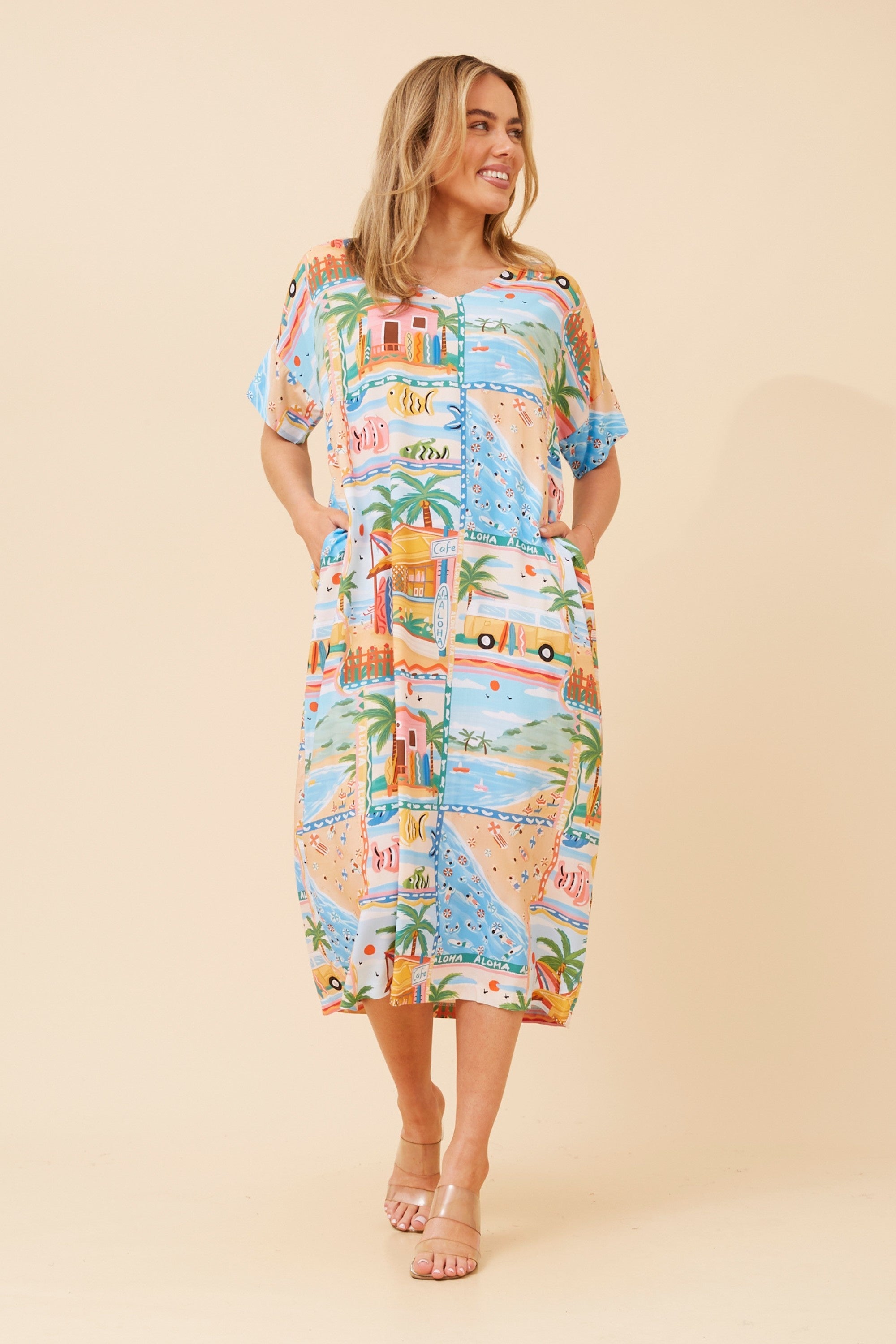 Casual, playful and made for sunny days, the Aloha Midi Dress is one of those easy pieces you will keep reaching for. With its relaxed shape and wanderlust print, it feels carefree and comfortable while still looking beautifully put together. It is the kind of dress that slips on effortlessly and instantly sets the mood for relaxed days and happy plans.