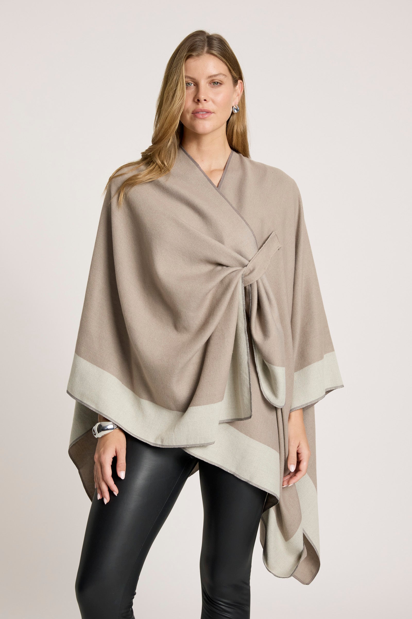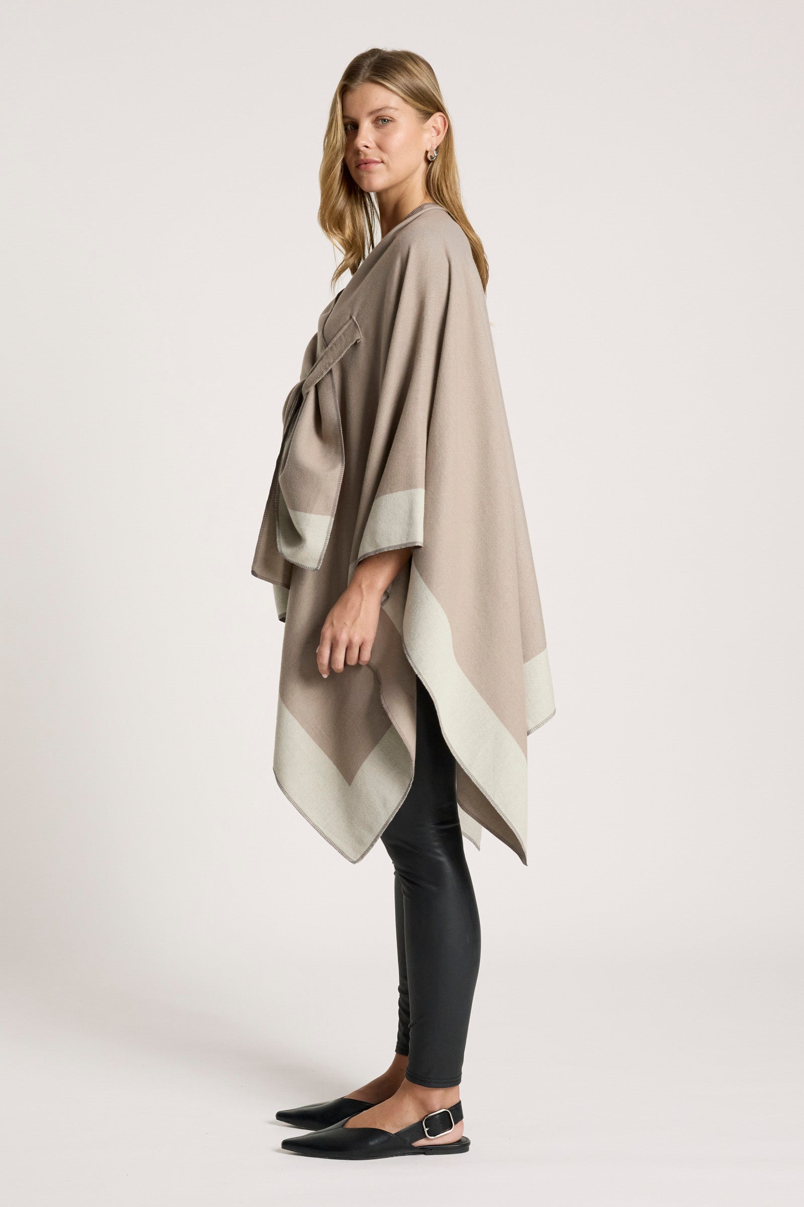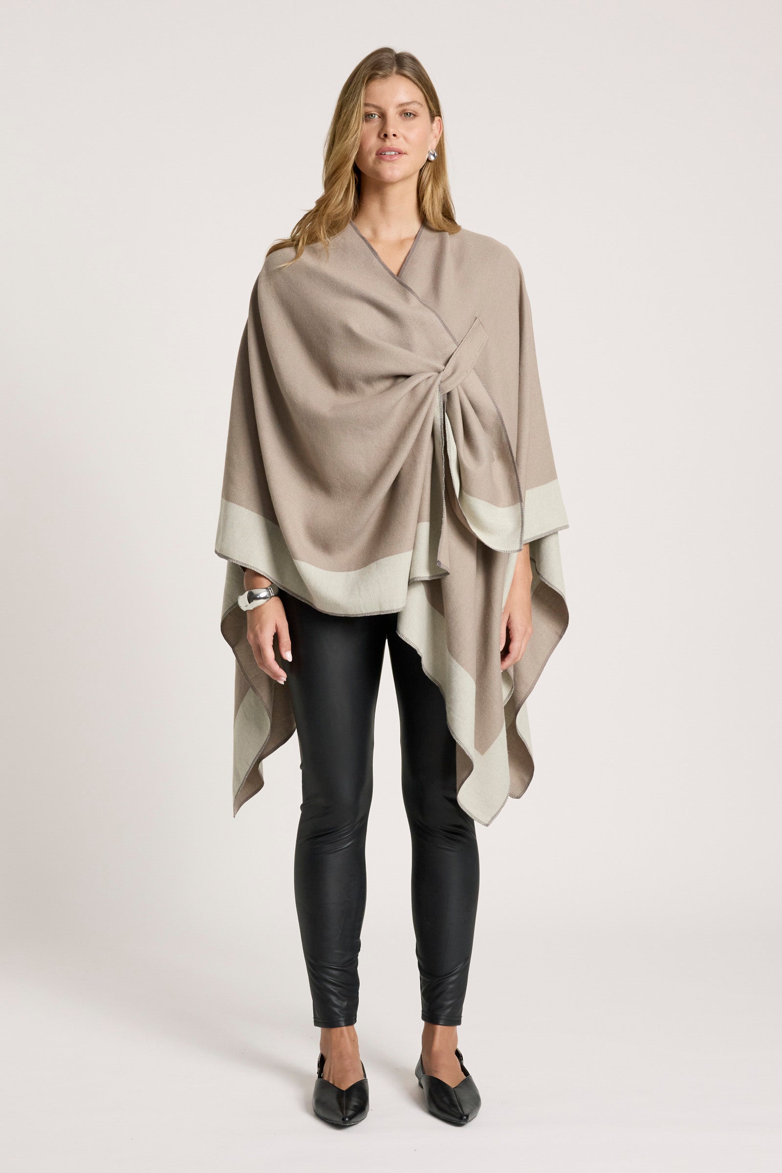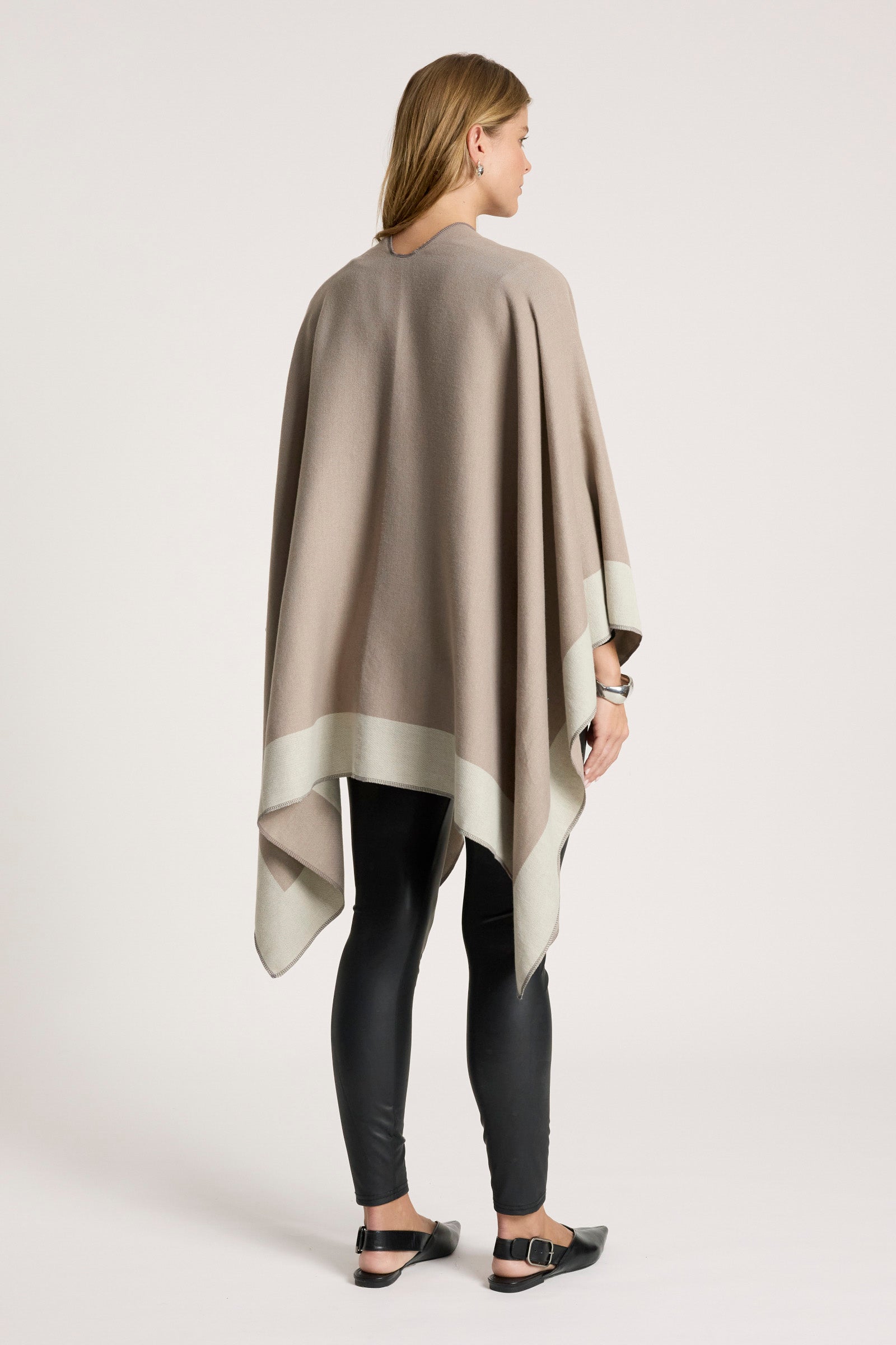 A unique, softly draped cape designed to add interest to everyday outfits. Featuring a reversible design with a subtle twist detail and loop fastening on one side, the Ayla Cape offers versatile styling and effortless layering.