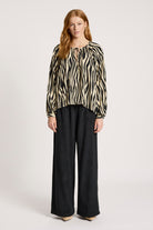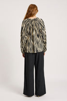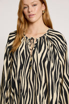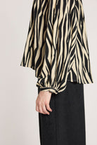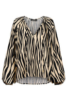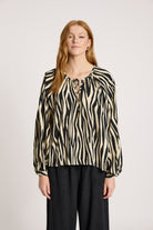A softly draped blouse crafted from a soft-washed cotton-rayon blend. Designed with a relaxed fit, a gently bellowed sleeve with a buttoned cuff, and an open neckline finished with tie straps and subtle thread detailing. Lightweight and versatile with a touch of print-driven interest.
