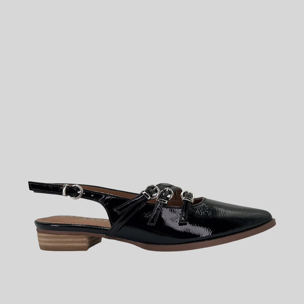 A gold-toned chain detail elevates the classic silhouette, making it an easy choice for workwear or smart casual outfits. The glossy black patent finish pairs seamlessly with tailored pieces, monochrome looks, and relaxed neutrals.