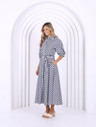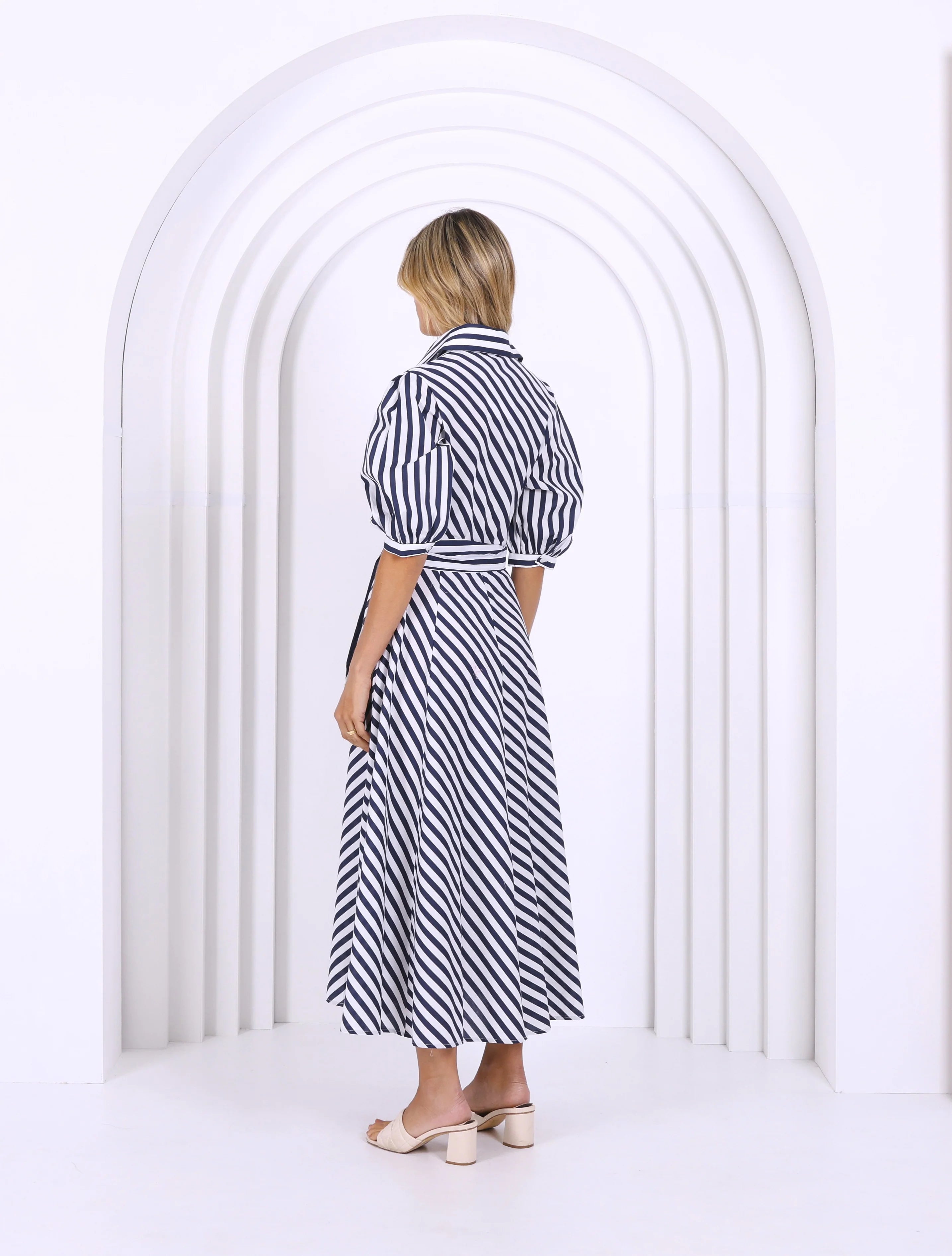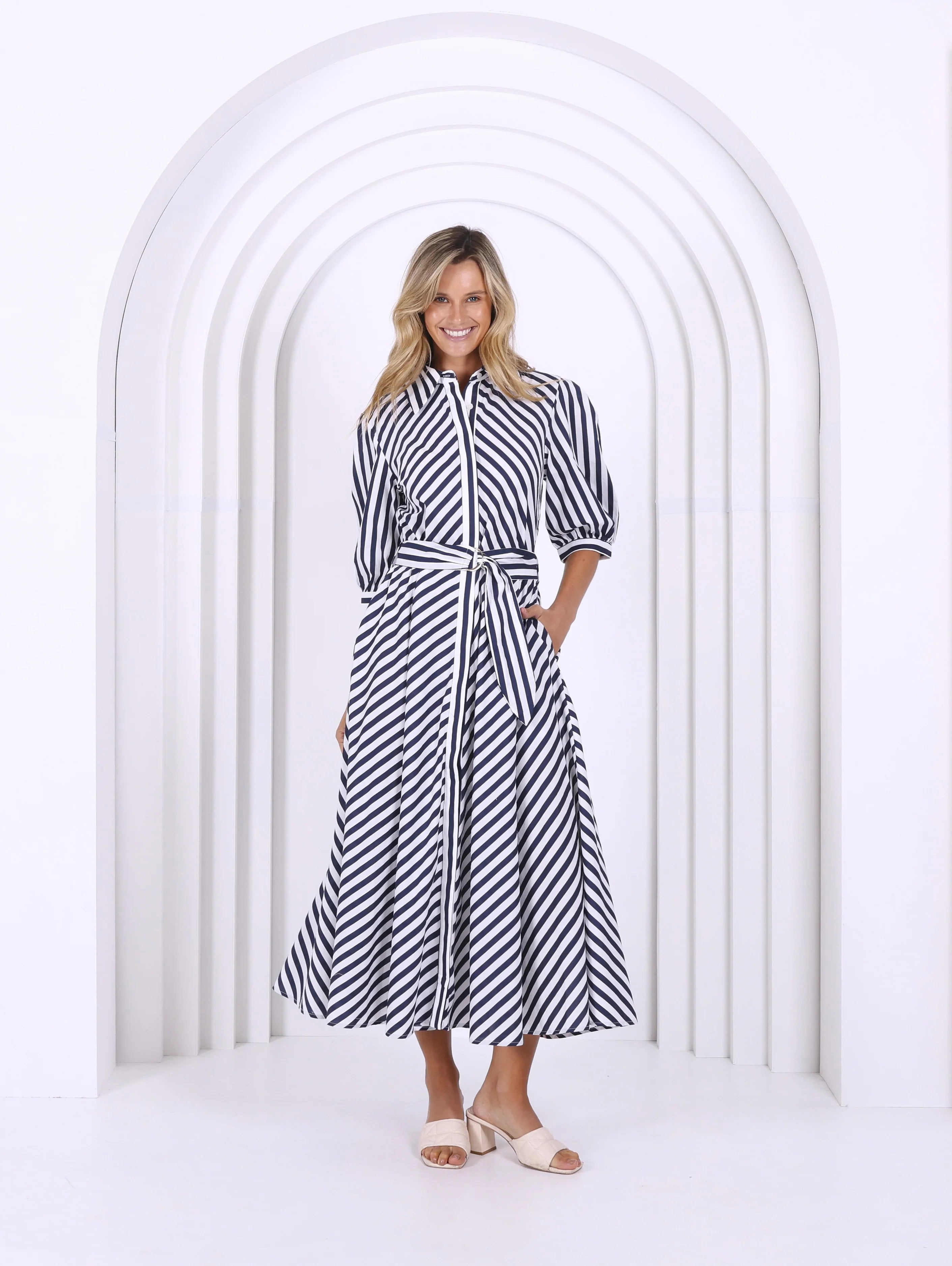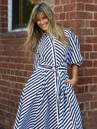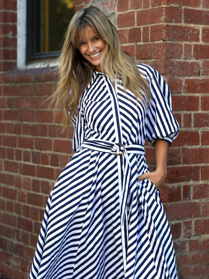 This gorgeous cotton shirtdress brings an easy, polished charm to summer days. The yarn-dyed stripes create a classic, preppy feel, while the relaxed bodice and softly flared A-line skirt keep things comfortable and breezy. The signature pleated balloon sleeves add a touch of playful detail, and the removable belt gives you the choice to wear it shaped at the waist or free and flowing. It’s the kind of piece that feels effortless the moment you slip it on.