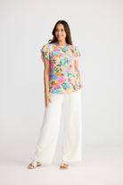 Soft, airy and effortlessly pretty, the Boulevard Top is a wardrobe favourite for warm days. Designed with flutter raglan sleeves for a touch of movement and charm, this top drapes beautifully in its lightweight viscose-linen blend. Pintuck detailing at the back adds subtle texture, while the keyhole closure gives a refined finish. The hip-length cut makes it perfect for pairing with shorts, skirts or relaxed linen pants.