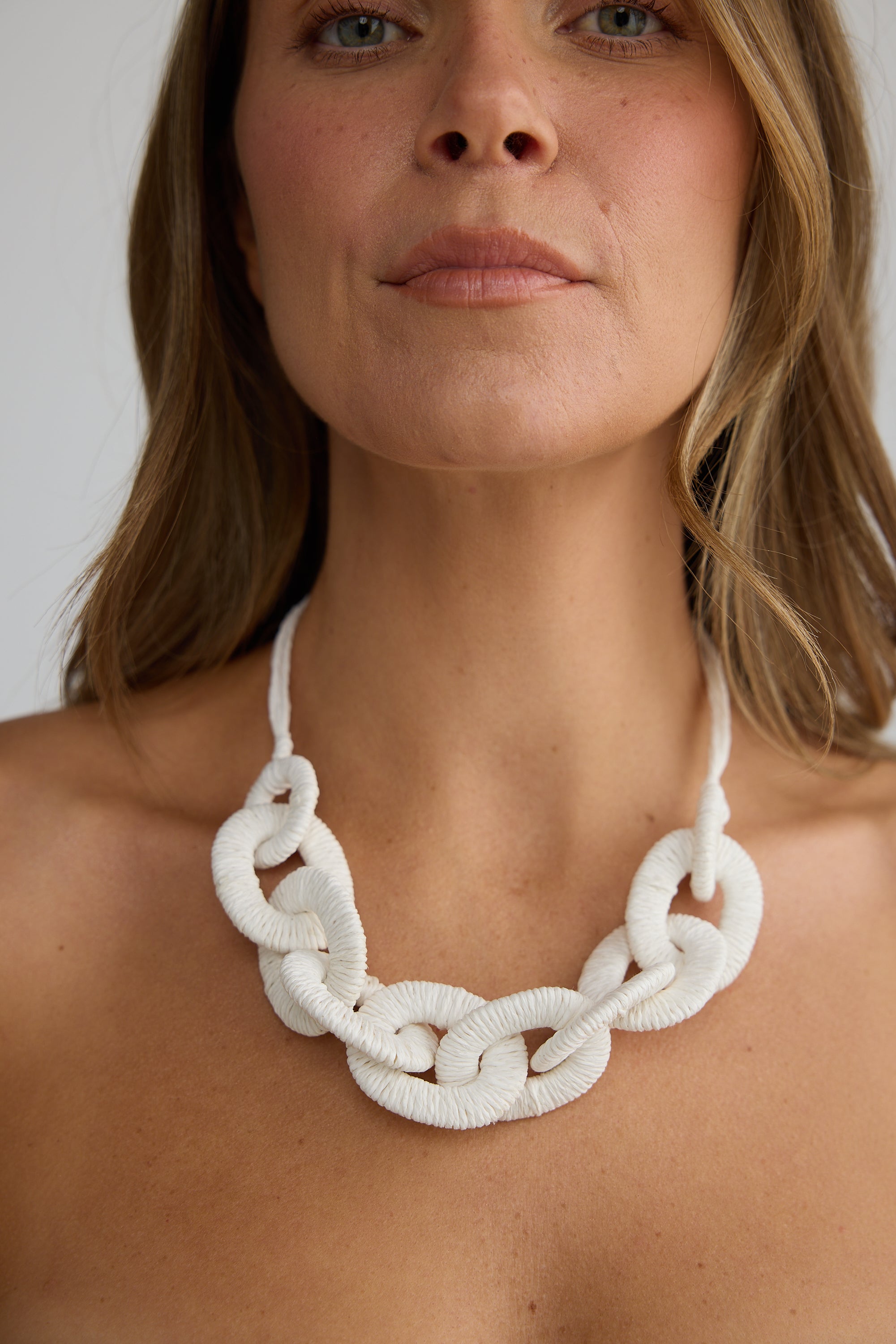 Add a touch of effortless charm to any outfit with the Chained Up Necklace. Lovingly handmade in India, this statement piece combines natural fibres with stylish link detailing, creating a look that’s both casual and sophisticated. The adjustable 5cm chain means it can be worn just the way you like, making it a versatile addition to your jewellery collection.