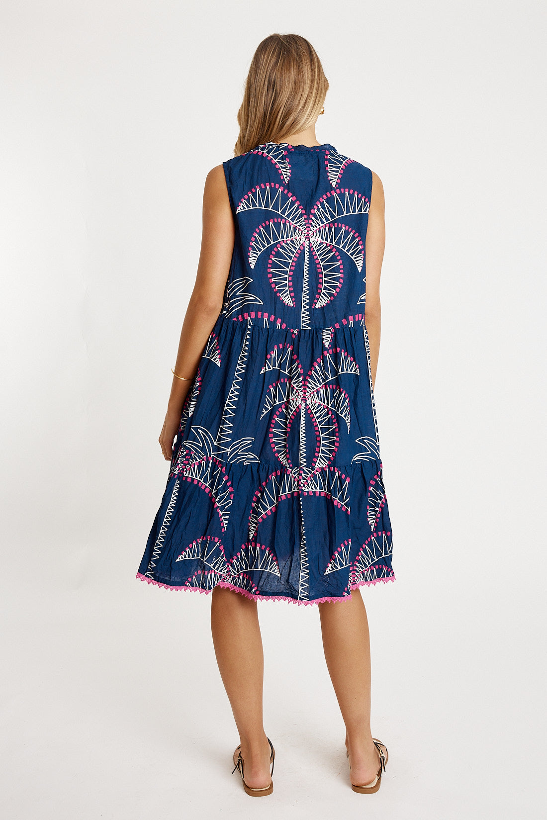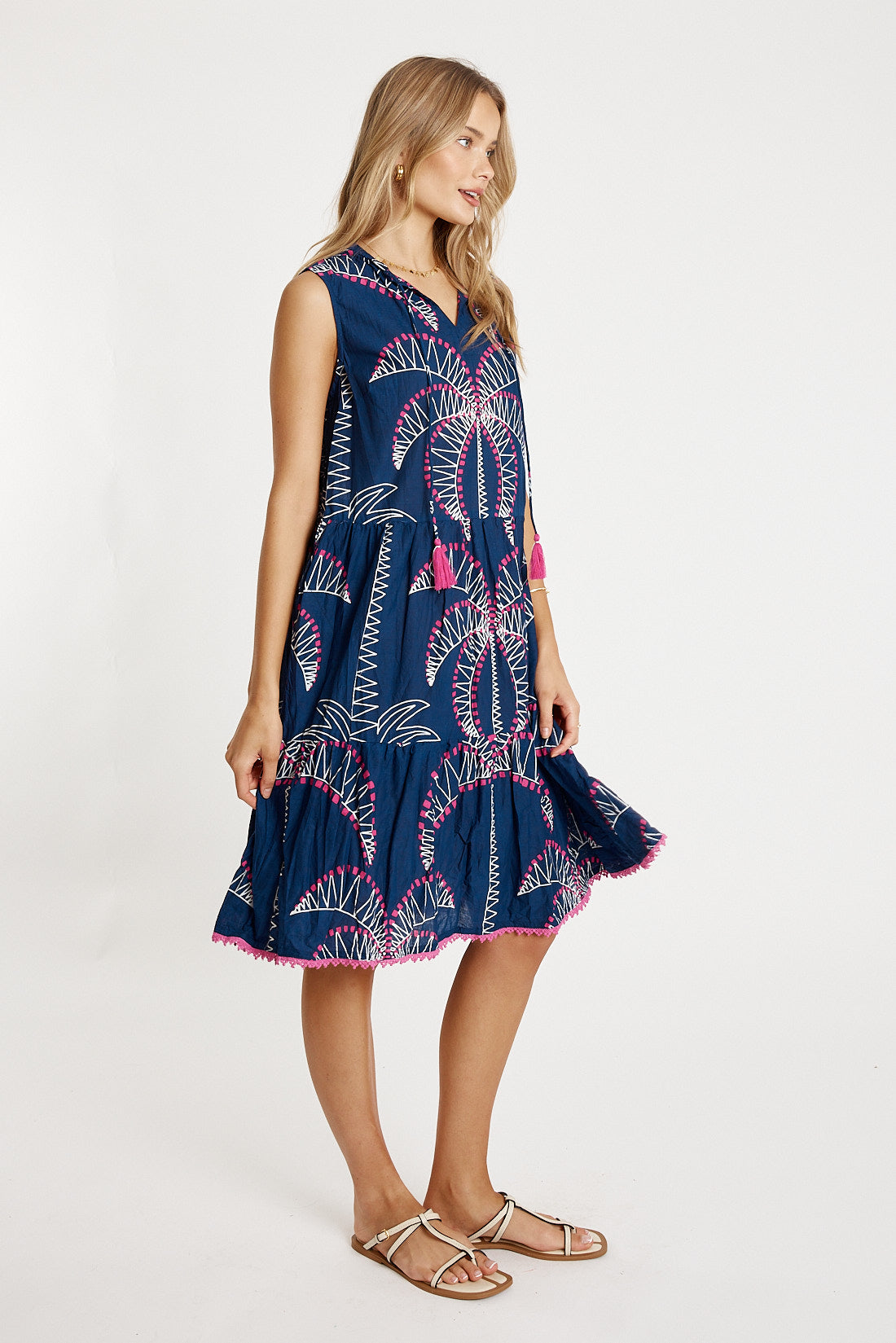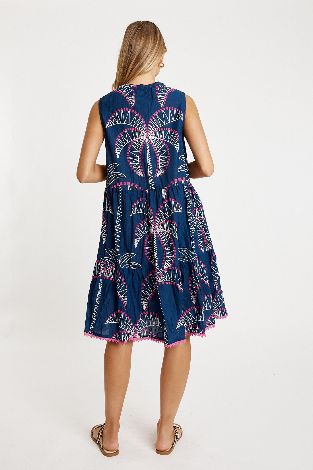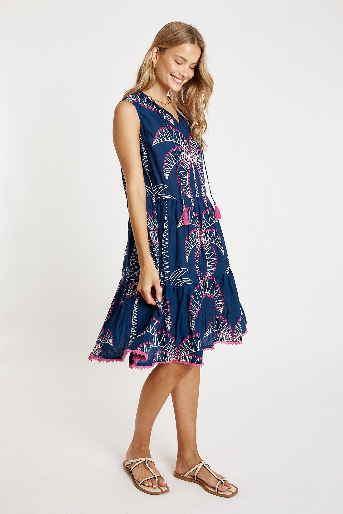This sleeveless take on the Idalia brings the same joyful navy, white and hot pink print in a soft crinkle cotton that needs no ironing. The relaxed V neckline features a sweet tie detail, and the easy shape makes it perfect for warm days when comfort is key. With practical pockets and a pretty lace trim at the hem, it’s a simple, breezy style that feels fresh and fun every time you slip it on.