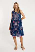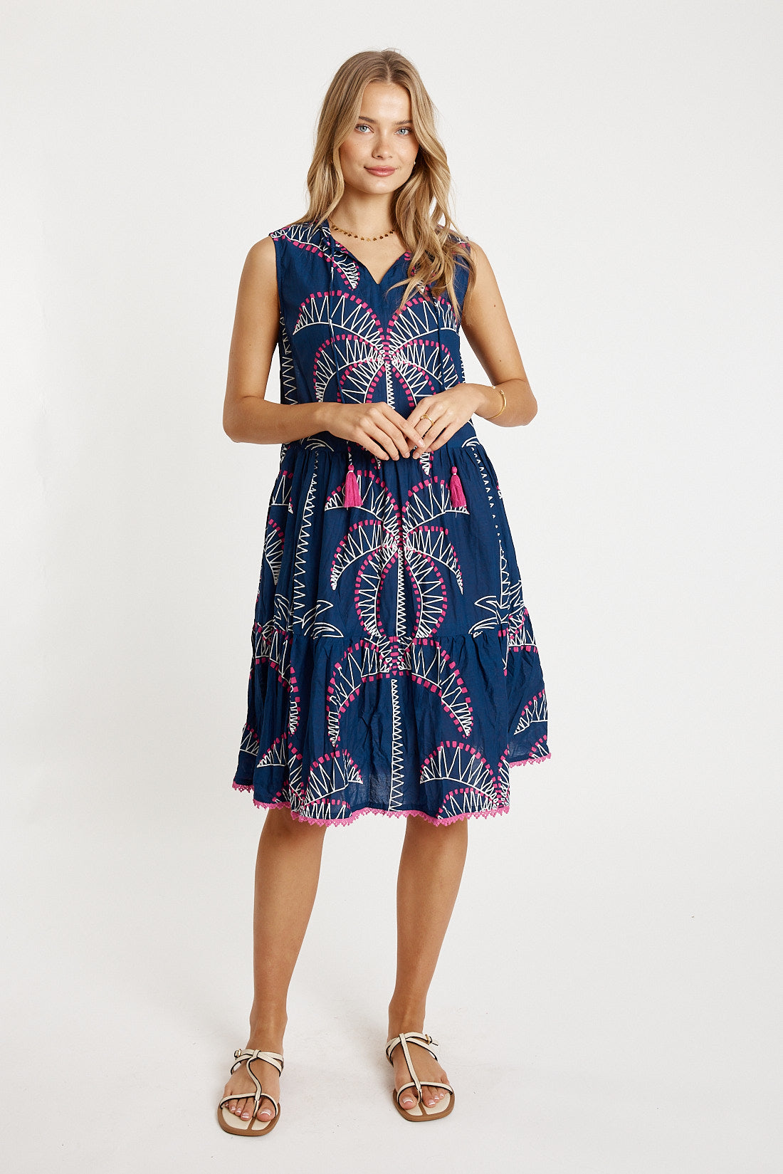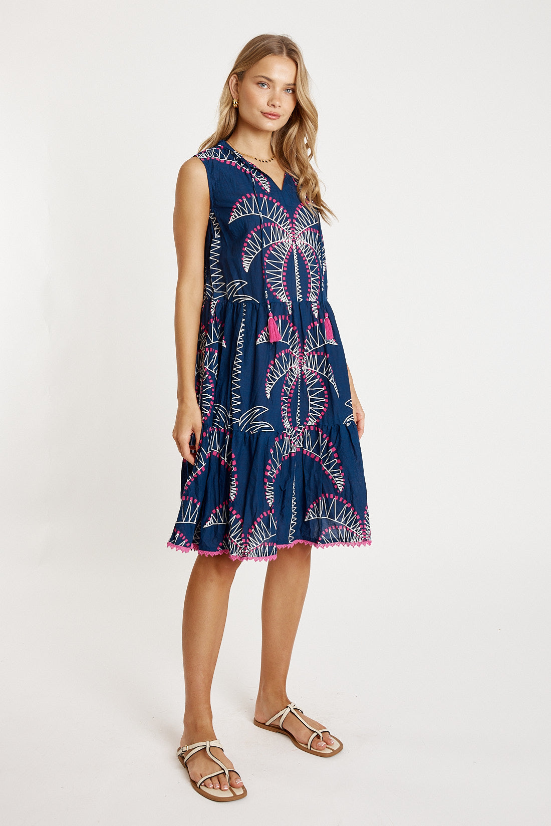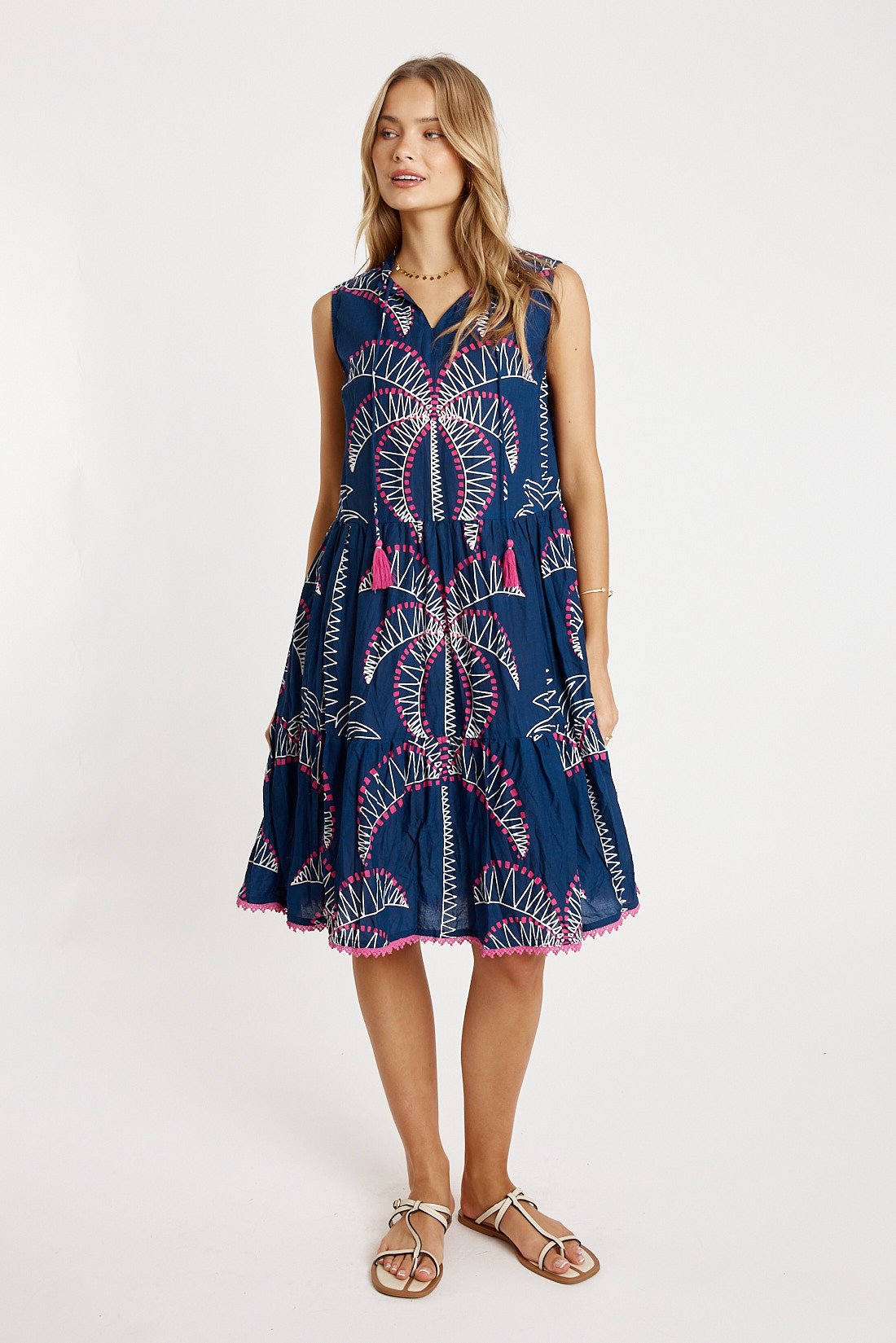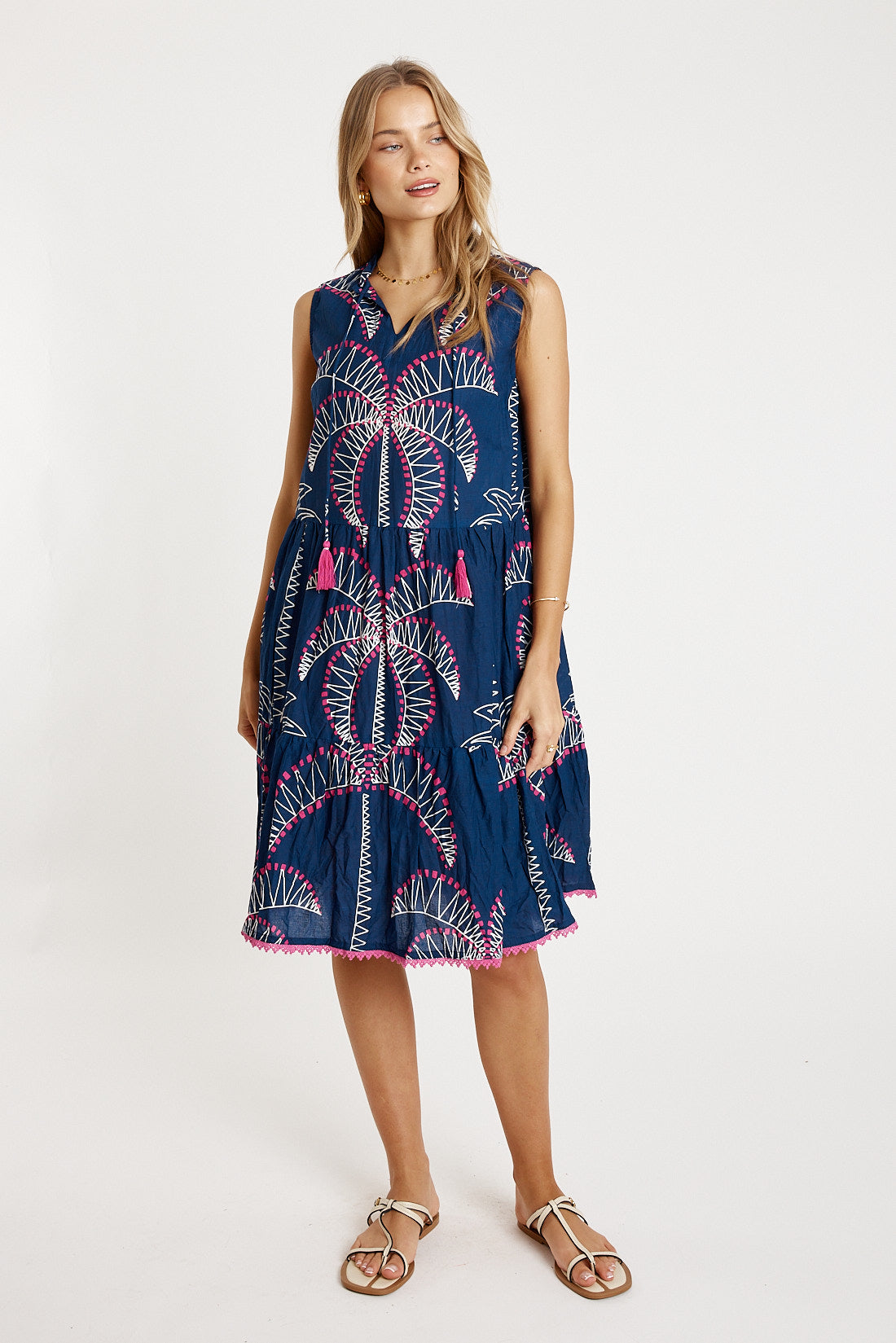 This sleeveless take on the Idalia brings the same joyful navy, white and hot pink print in a soft crinkle cotton that needs no ironing. The relaxed V neckline features a sweet tie detail, and the easy shape makes it perfect for warm days when comfort is key. With practical pockets and a pretty lace trim at the hem, it’s a simple, breezy style that feels fresh and fun every time you slip it on.