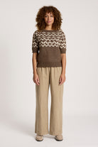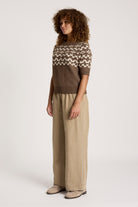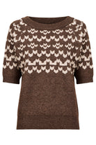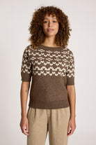 A modern take on a Fair Isle-inspired knit. The Maasai Knit Top features a two-tone patterned design with a thick ribbed, relaxed round neckline and short sleeves. Warm, textured and easy to wear, it brings subtle statement to everyday winter outfits.