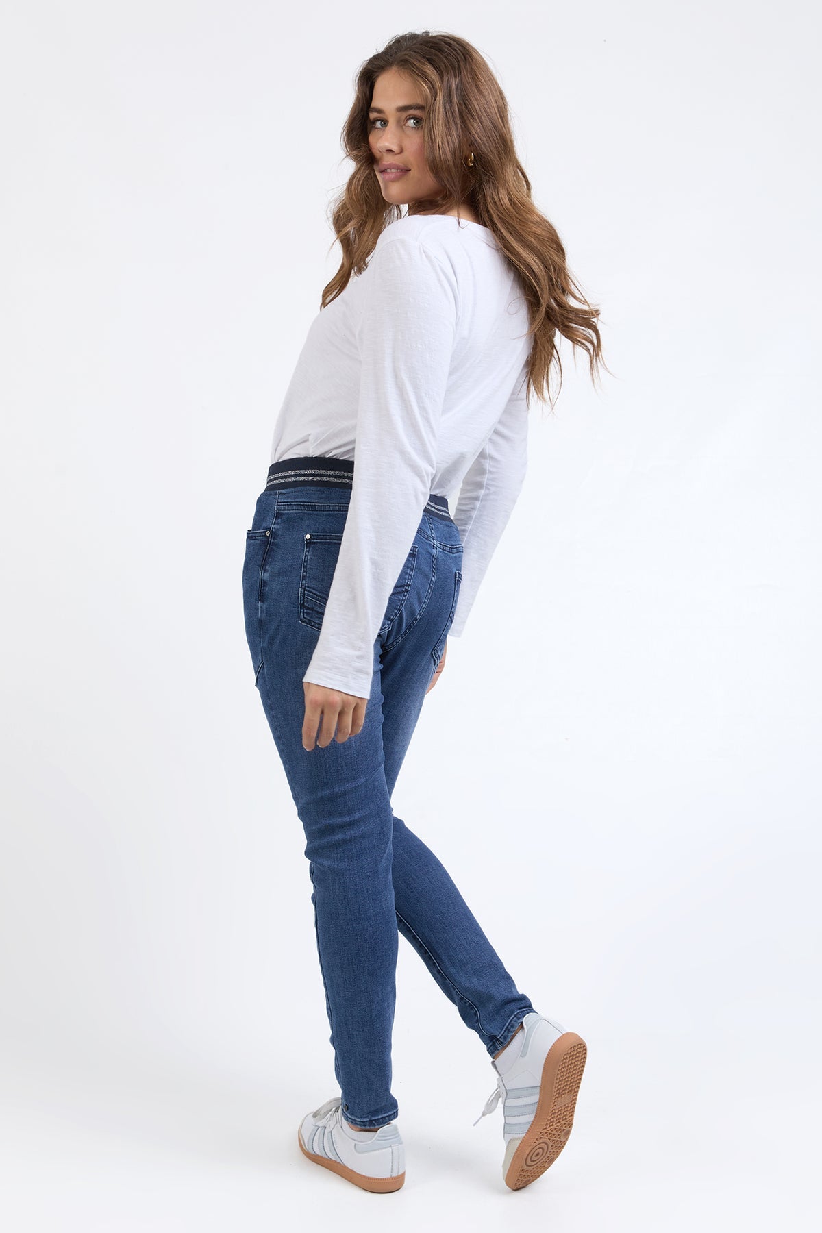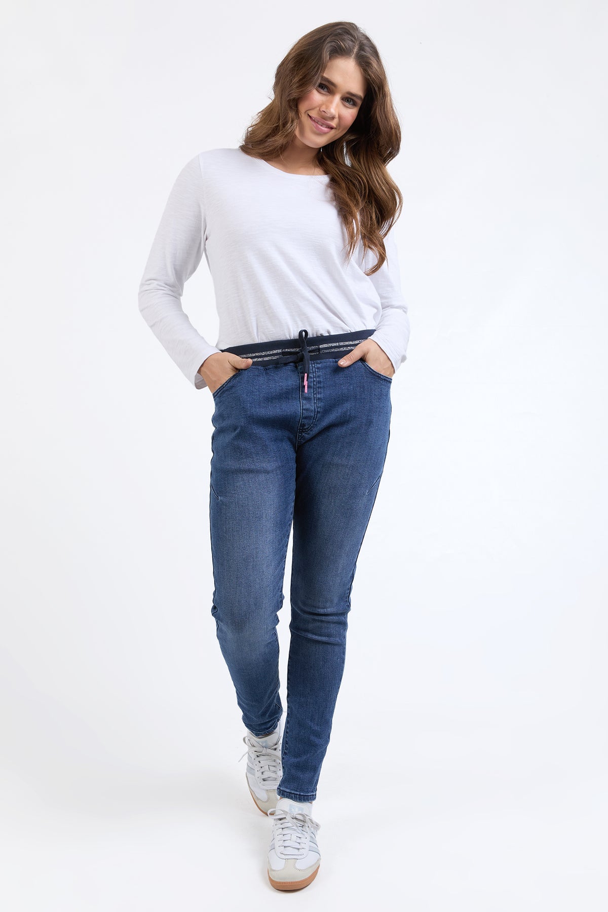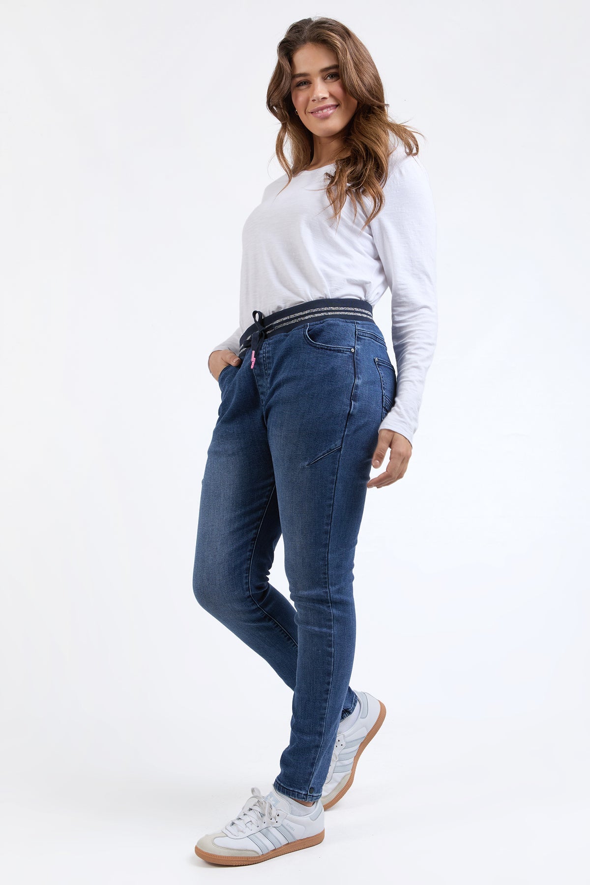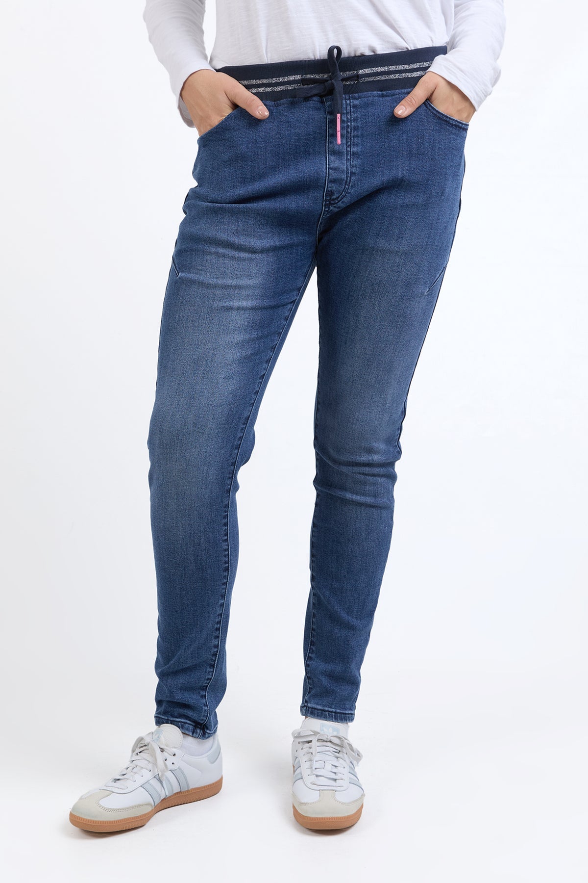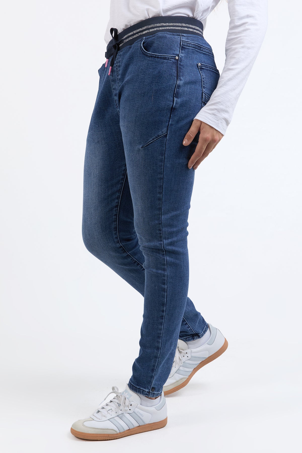 The Melody Denim Jogger is one of those pieces that works hard and looks good doing it. Designed in a soft stretch denim with a flattering slim leg, this style brings together everyday comfort and easy polish. The ribbed waistband with a subtle metallic stripe adds a fun little twist, while keeping things comfy where it counts.