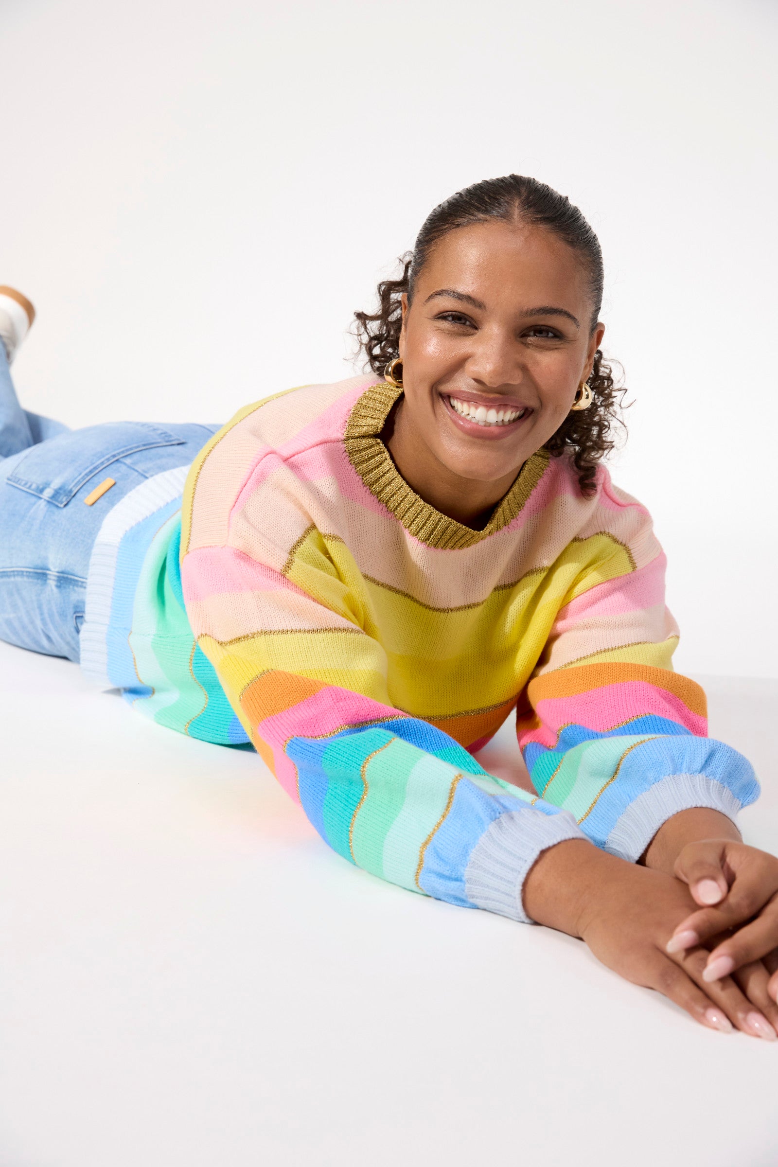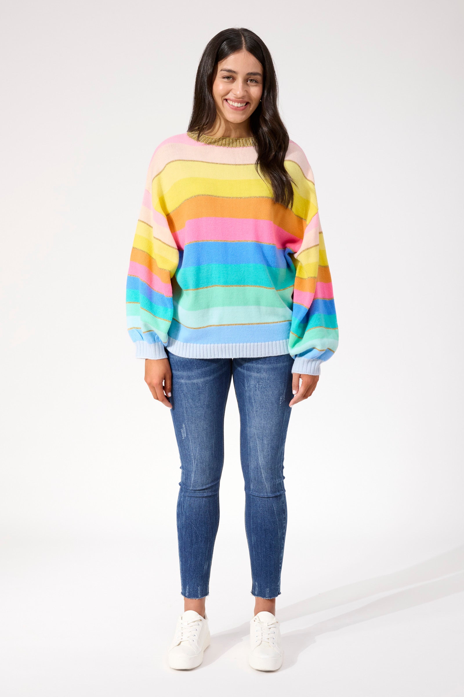 A feel-good knit designed to bring colour to cooler days. The Niseko Jumper features a custom multicolour stripe design with fine sparkle threading woven throughout the knit. Soft, relaxed and easy to wear, it's an effortless way to add interest to everyday dressing.