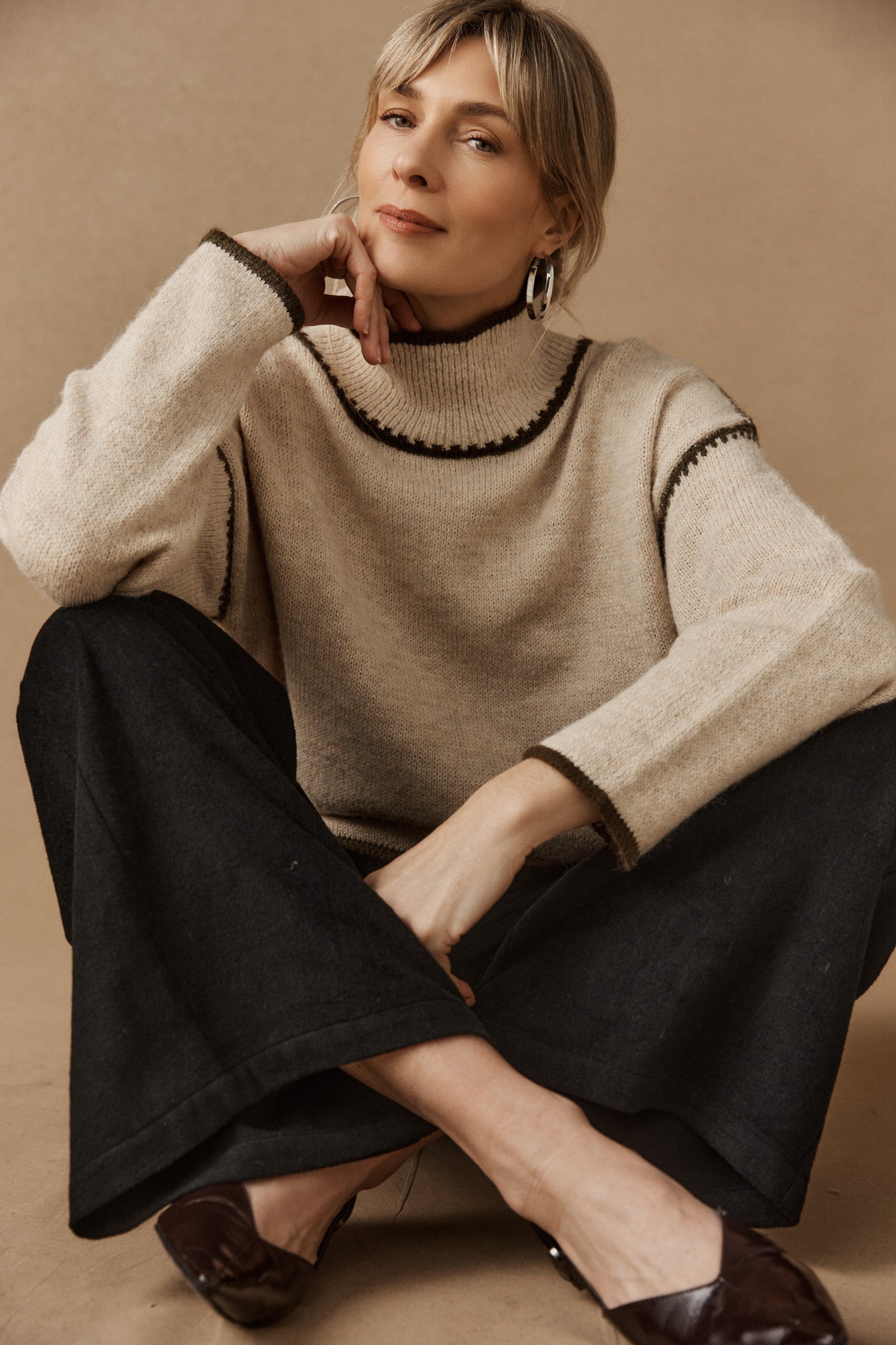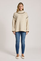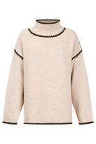 A cosy jumper featuring distinctive blanket stitch detailing. Designed with a high but relaxed neckline for warmth without feeling restrictive, this best-selling style combines comfort with modern appeal. Easy to wear and endlessly versatile.