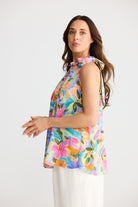 Effortless style meets everyday comfort in the Soul Top. Featuring a soft, flowy silhouette with a classic fit, this sleeveless raglan design flatters while keeping you cool on warm days. The high neckline with tie detail adds a touch of elegance, making it easy to dress up or down for any occasion. Crafted from a lightweight viscose-linen blend, it feels soft and breathable all day long.