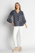 Bright, breezy, and beautifully detailed — the Talei Top is here to add a little joy to your wardrobe! Crafted from soft cotton in an exclusive print, it’s designed with a flattering V-neckline and pretty 3/4 sleeves finished with a delicate frill for that extra touch of charm.