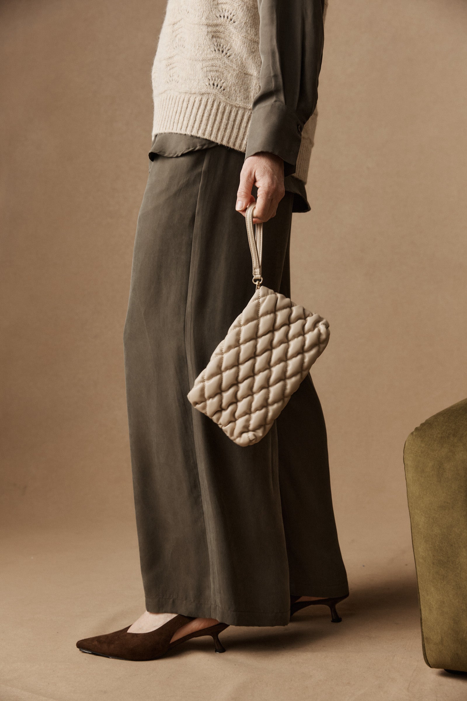 A softly cushioned pouch designed with a supple leather-look finish. Featuring a comfortable wrist strap and padded structure, this compact accessory is ideal for carrying essentials with ease and polish.