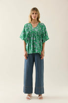 A colourful cotton voile piece with artisanal charm, inspired by floral hand-block. The Wilma Top is hand screen printed and features a soft front yoke, shirred 3/4 sleeves and a relaxed silhouette for everyday ease.