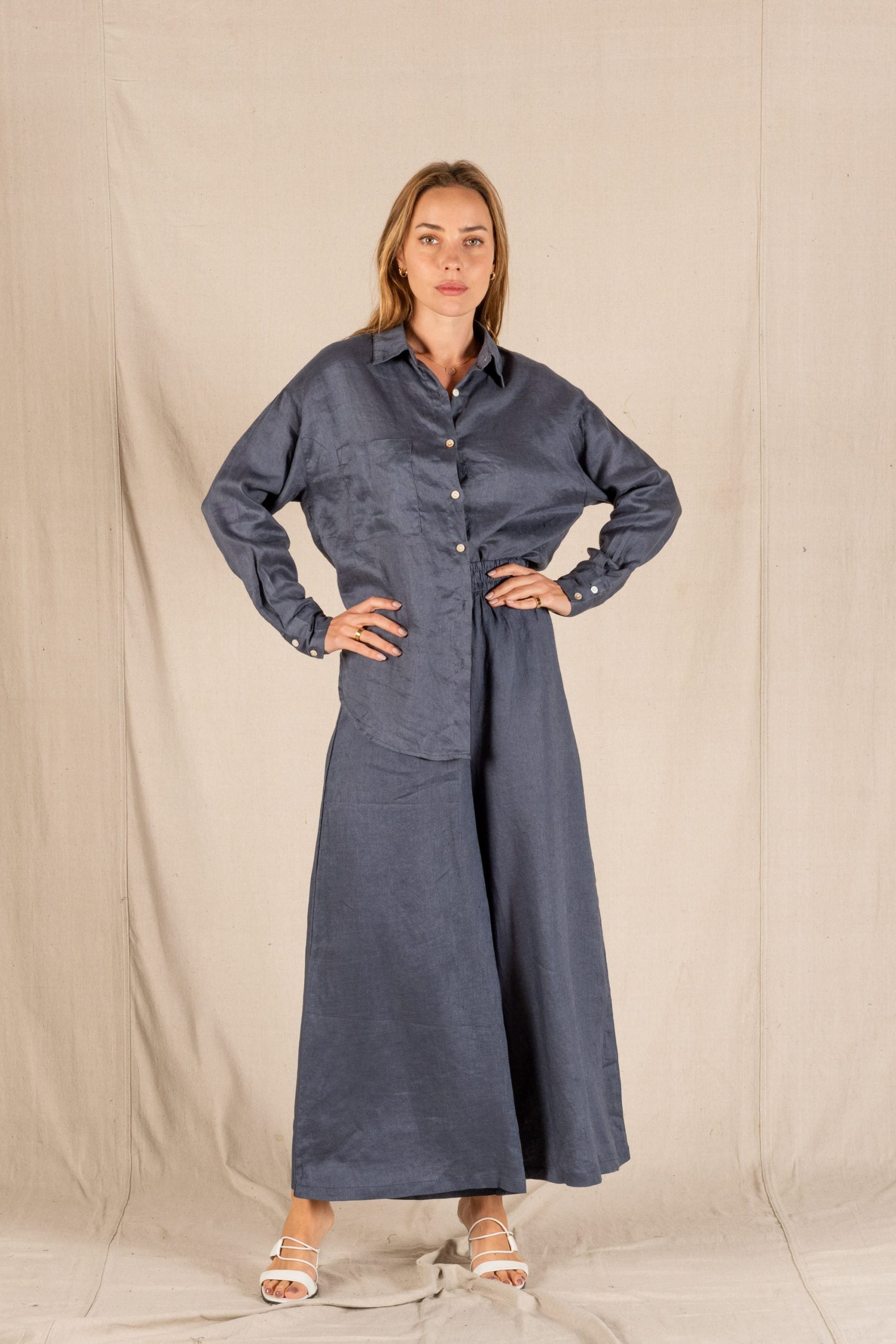Relaxed, flattering and beautifully simple, the Aria Linen Pant is all about effortless comfort with a polished finish. Made from breathable linen, this wide leg style drapes softly through the leg while the elastic waist keeps things easy and wearable all day long. With no pockets, the hip line stays clean and smooth, making these a dream to style up or down.