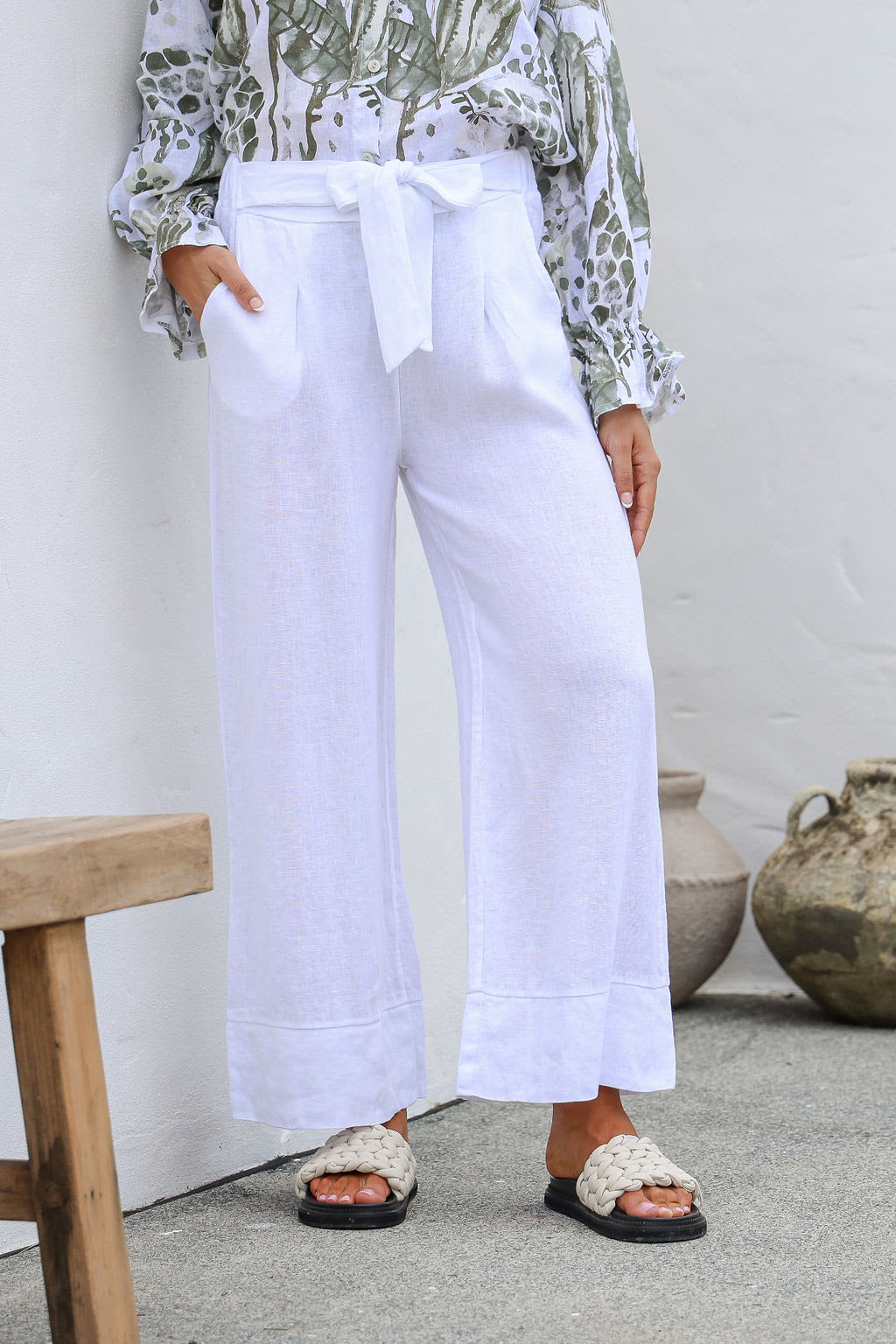 These Uno Pants in White are made from high-quality linen, perfect for keeping you cool and comfortable on warm days. Crafted in Italy, they feature a tie front and elastic waist at the back for a customizable fit. With convenient pockets and a flattering wide leg, these pants are a must-have for any wardrobe.