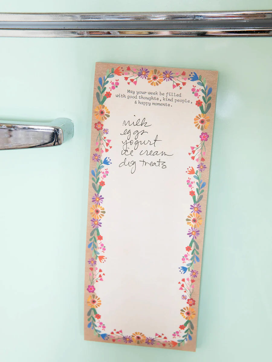 Keep your to-do's and shopping lists organized with this Magnetic List Pad that has a folk flower print and our sweet sentiment, "May Your Week Be Filled With Good Thoughts, Kind People & Happy Moments." Stick it right on the fridge or keeping it at your desk or in your car! This unlined notepad comes with a magnet back and 75 easy, tear-off pages for all of your quick note needs!
