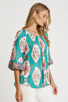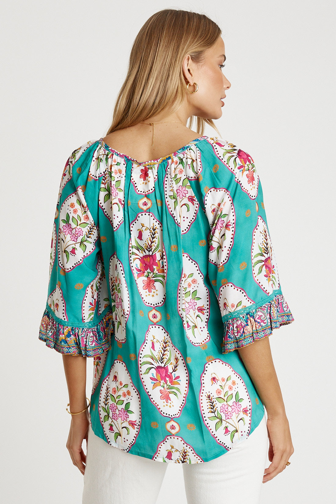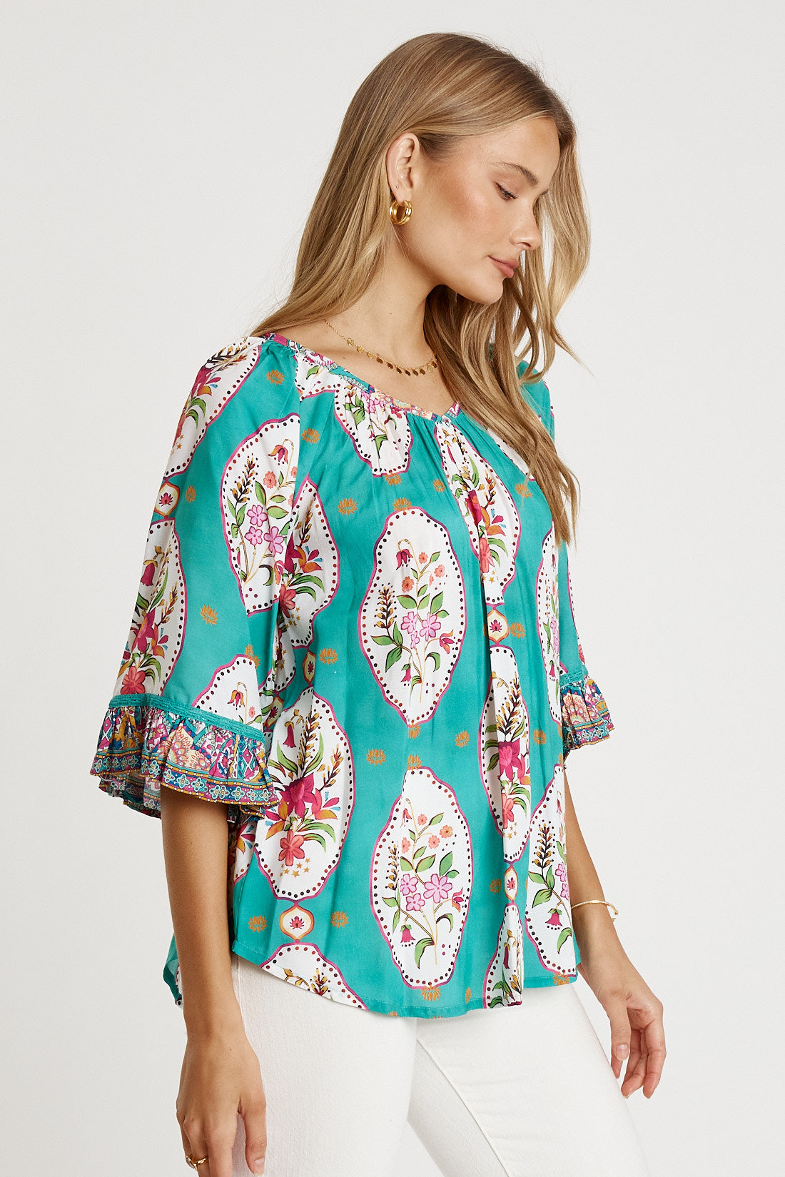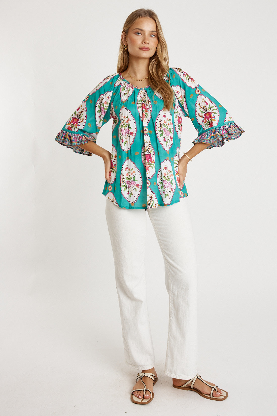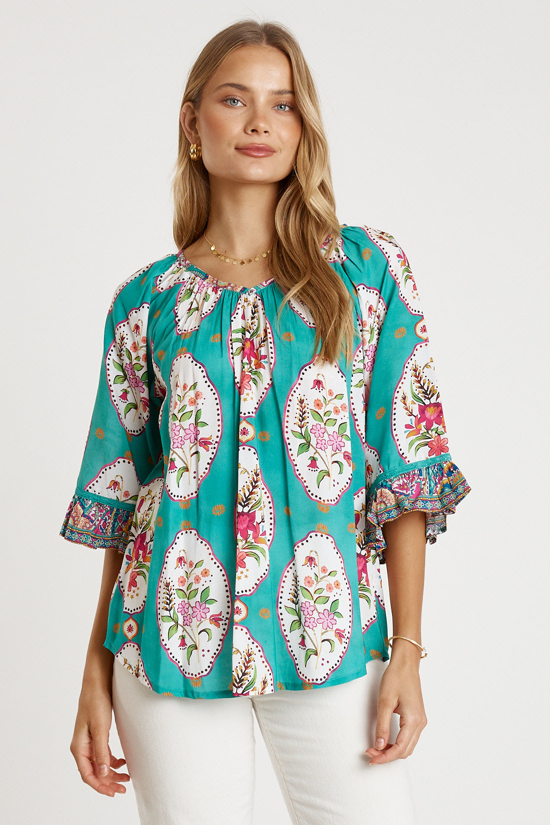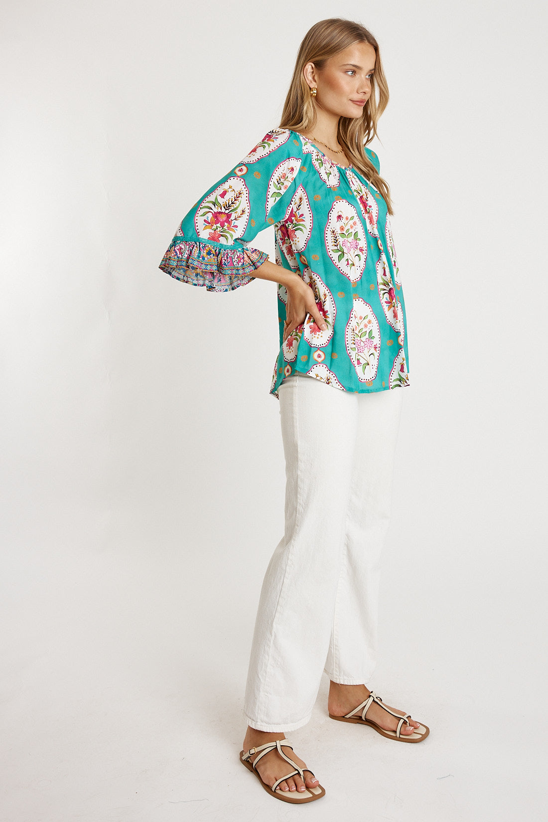 Bright, breezy and wonderfully easy to wear, the Imogen Top adds a fresh splash of colour to your everyday line-up. Made from soft, lightweight viscose, it drapes beautifully and feels cool on warm days. The relaxed V neckline with gentle gathers gives it an easy, flattering shape, while the wide raglan sleeves with a soft flounce bring lovely movement. Finished with a curved hem and a vibrant digital print, it’s an effortless go-to for relaxed outings, coffee dates or weekend adventures.