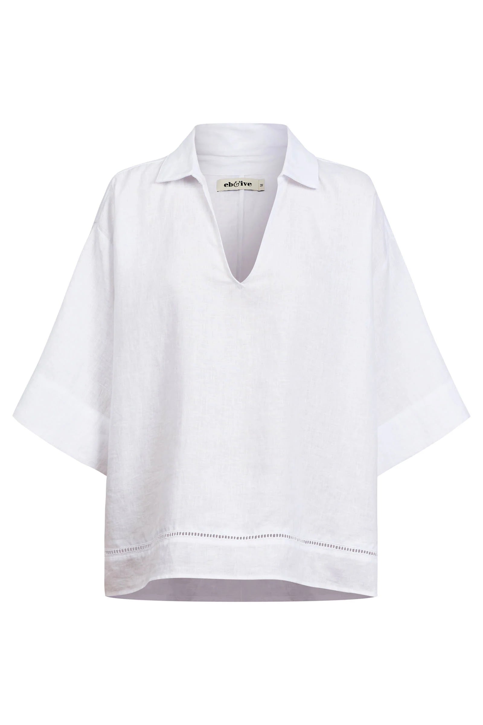 A refined top for versatile styling. Crafted from 100% Linen for breathable comfort. Features a Johnny collar style with an open neckline, ladder lace panel detail at the hem, and side splits for ease of movement.