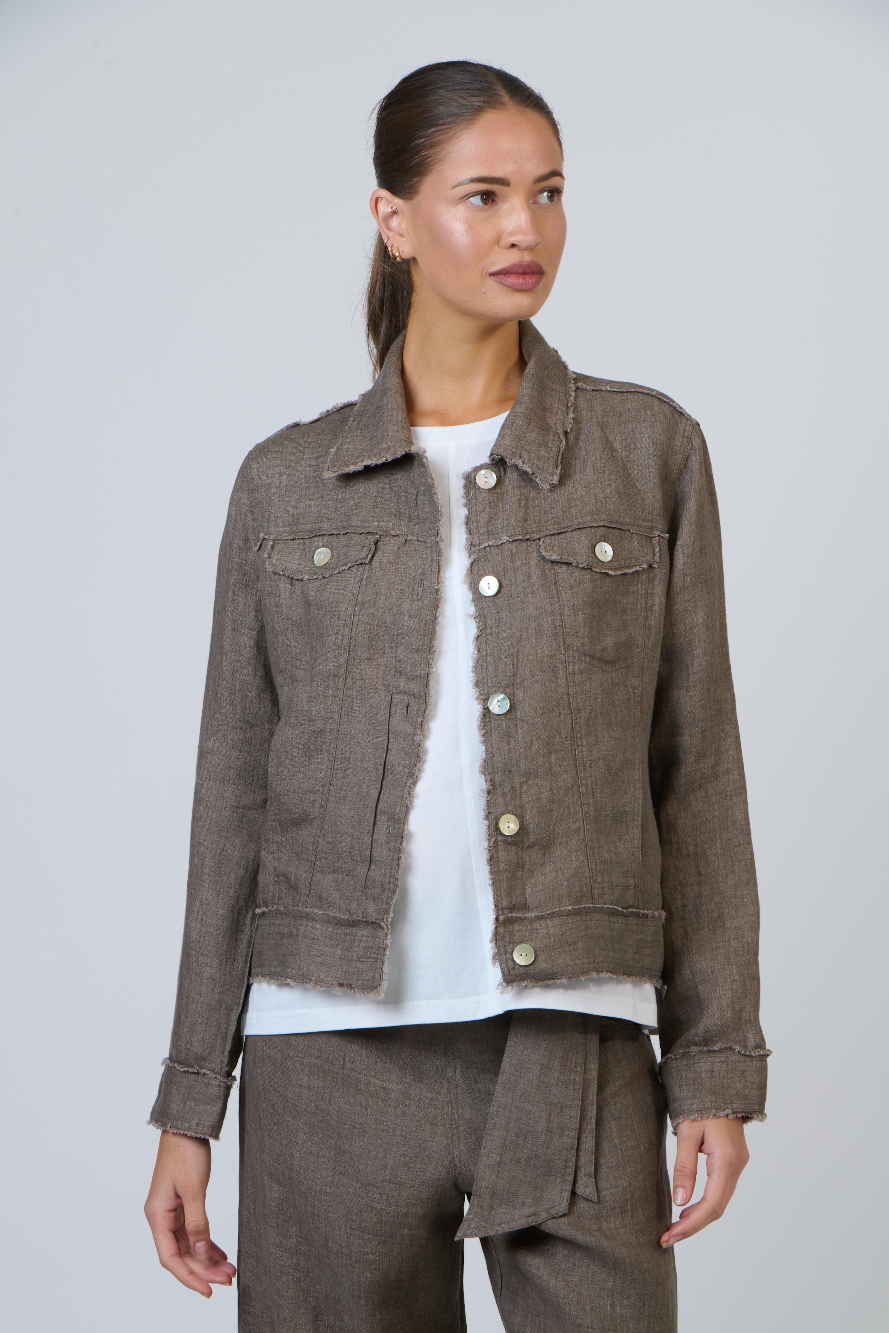 The jacket that goes with everything — and we mean everything. Crafted from 100% linen, this lightweight summer layer is your throw-on-and-go essential. With a classic point collar, full button-down front, and two flap pockets at the chest, it brings just the right amount of structure without ever feeling too done. The raw edge detailing adds a relaxed, lived-in charm that we absolutely love.