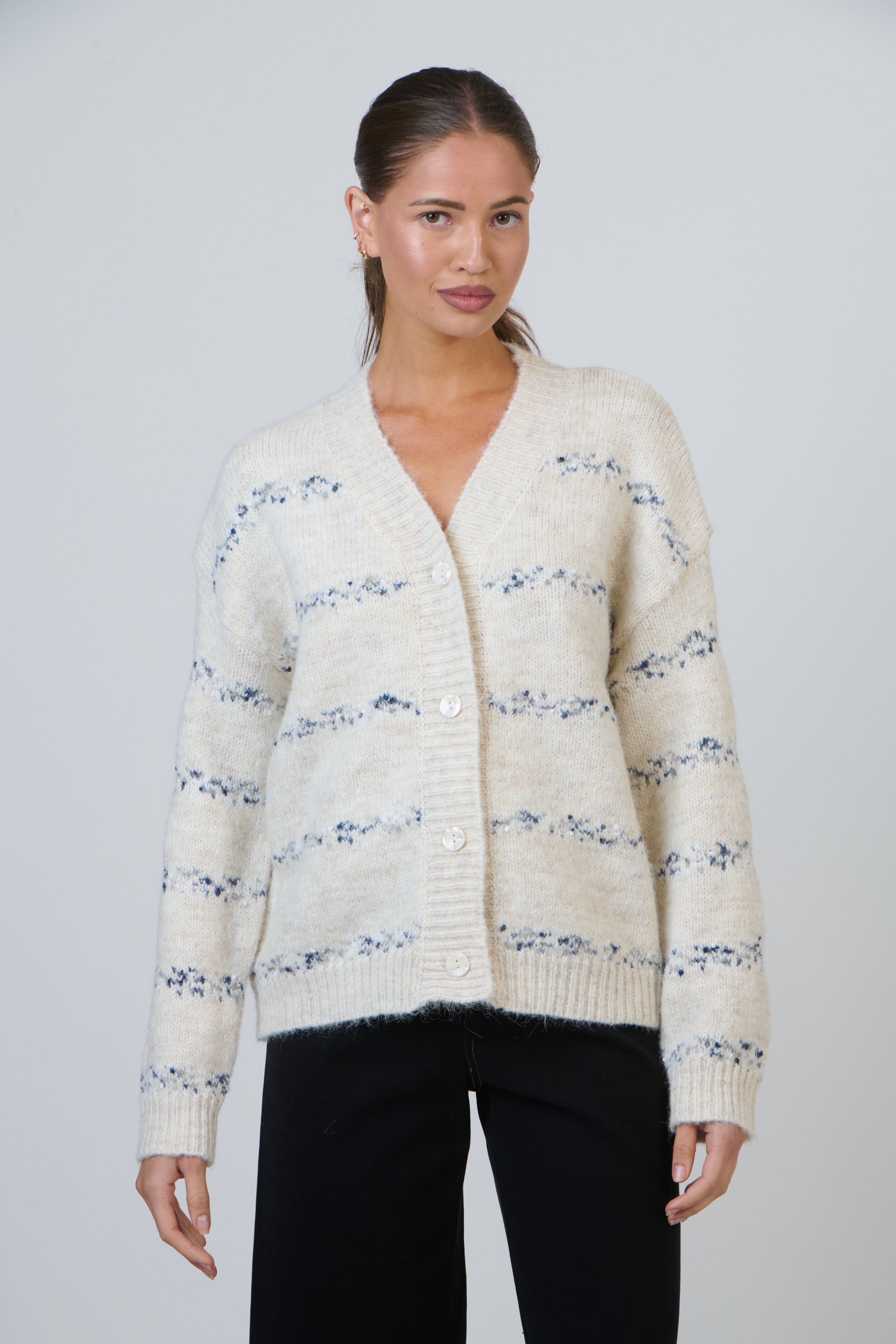 A cardigan that feels cosy yet quietly special. The Salt Cardigan features a soft speckled stripe pattern that creates beautiful texture, giving it that modern, slightly hand-crafted feel. The flattering V-neckline and classic button-front make it an easy layering piece, while the relaxed fit and hip-length cut offer comfortable coverage without feeling bulky. Ribbed cuffs and hem keep the shape looking neat and polished, making this a lovely piece to reach for again and again.