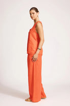 A relaxed essential with tailored flair. Crafted from 100% linen for breathable style. Features front button closures, curved hemline, and a D-ring puller at the back for a custom flattering fit at the waist.