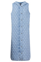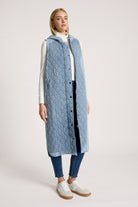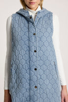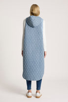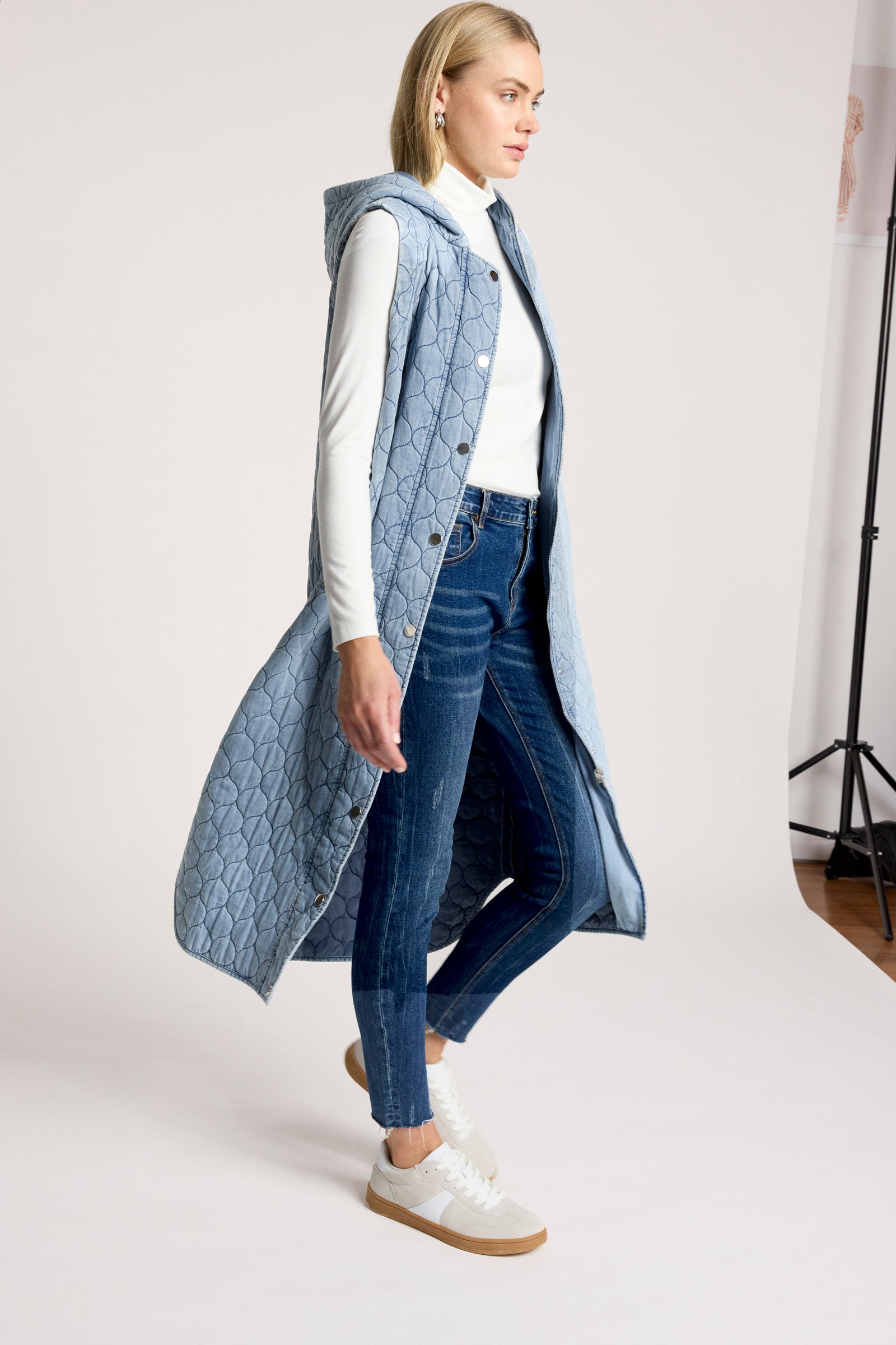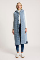A statement longline vest crafted from enzyme-washed denim with quilted detailing. Featuring a sleeveless silhouette, hooded design and silver hardware zip, this piece brings warmth and texture to winter layering.