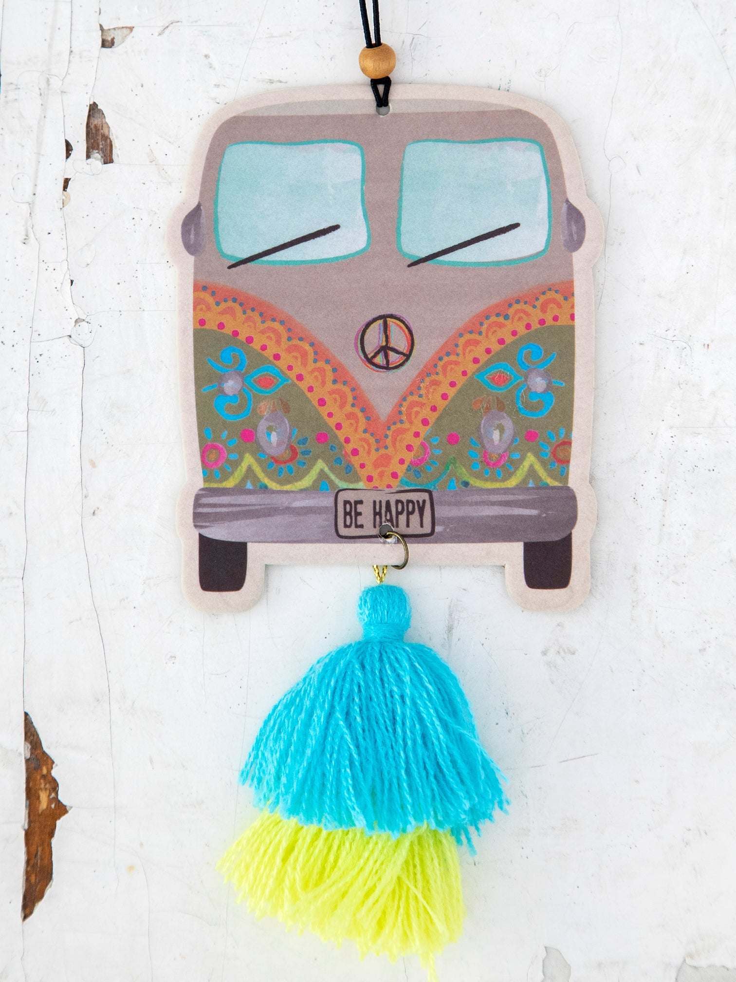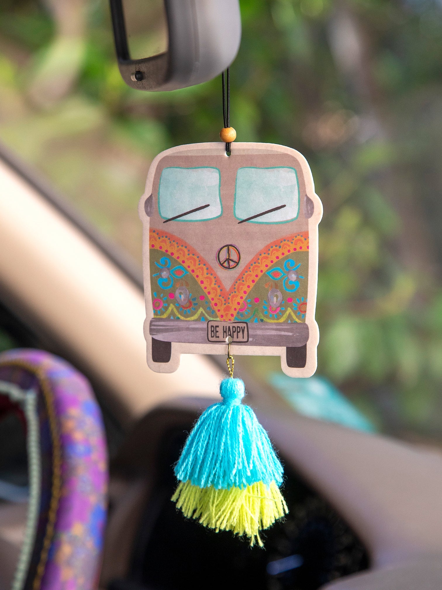 Scent: Orange. Features a stacked tassel and a wooden bead on an elastic hanger for easy placement. Double-sided, full-color quality printing
